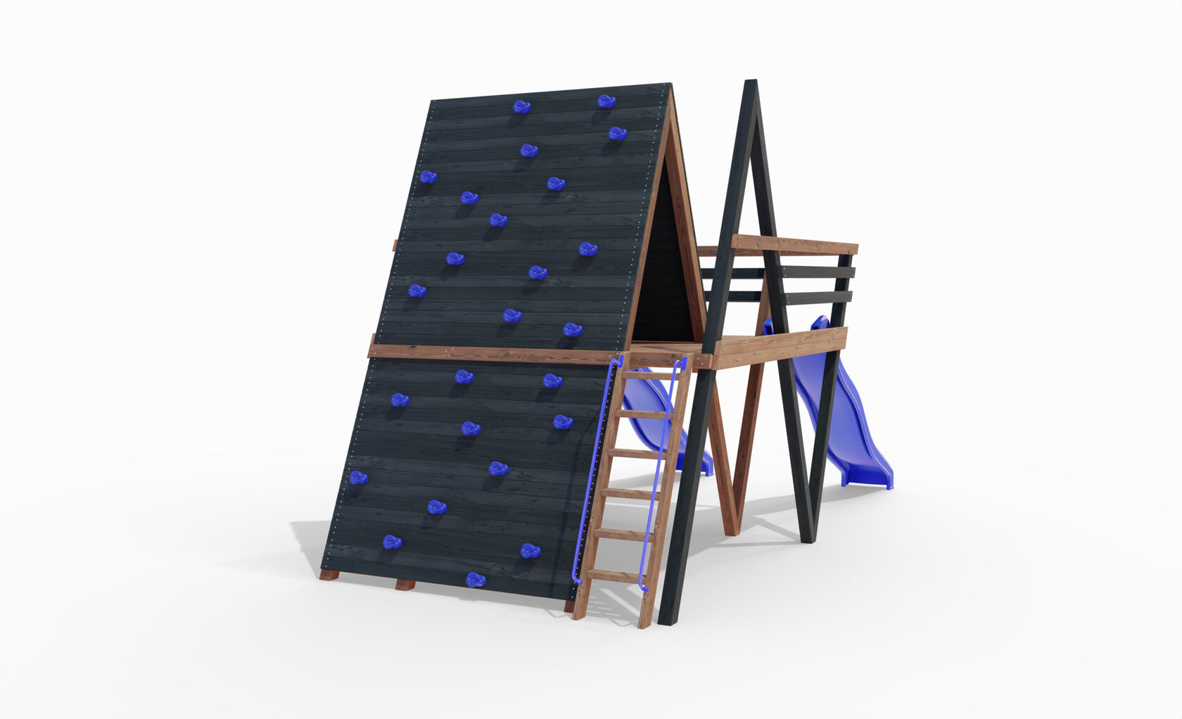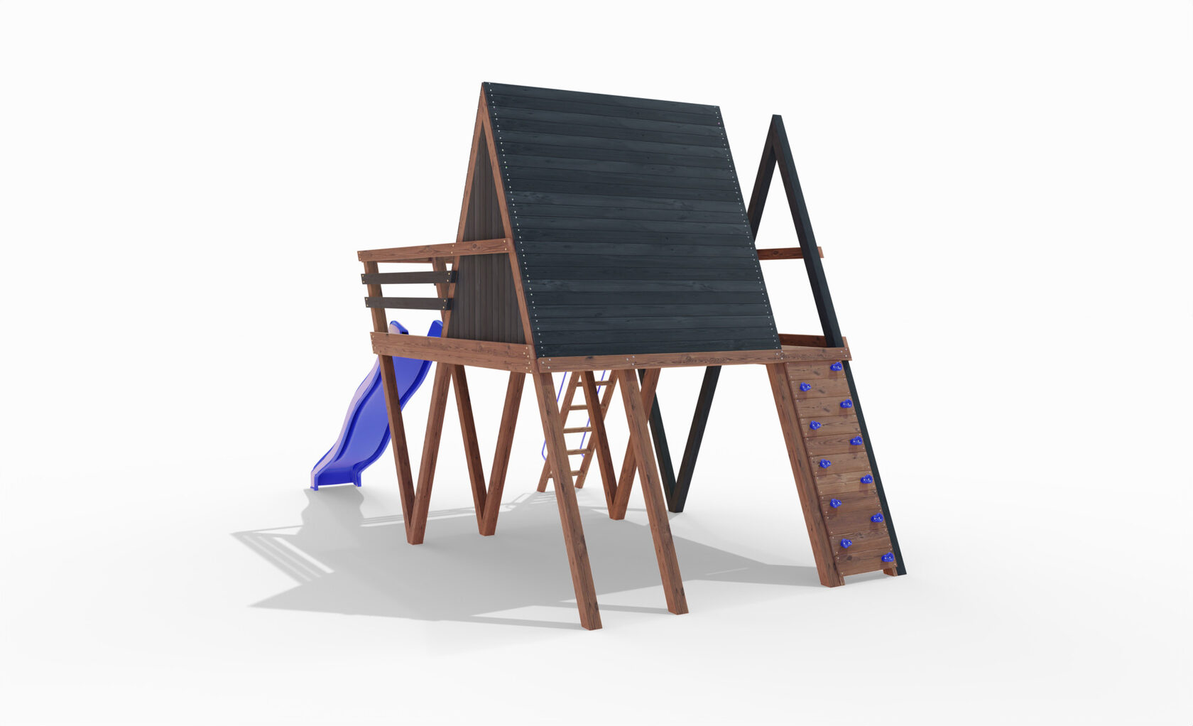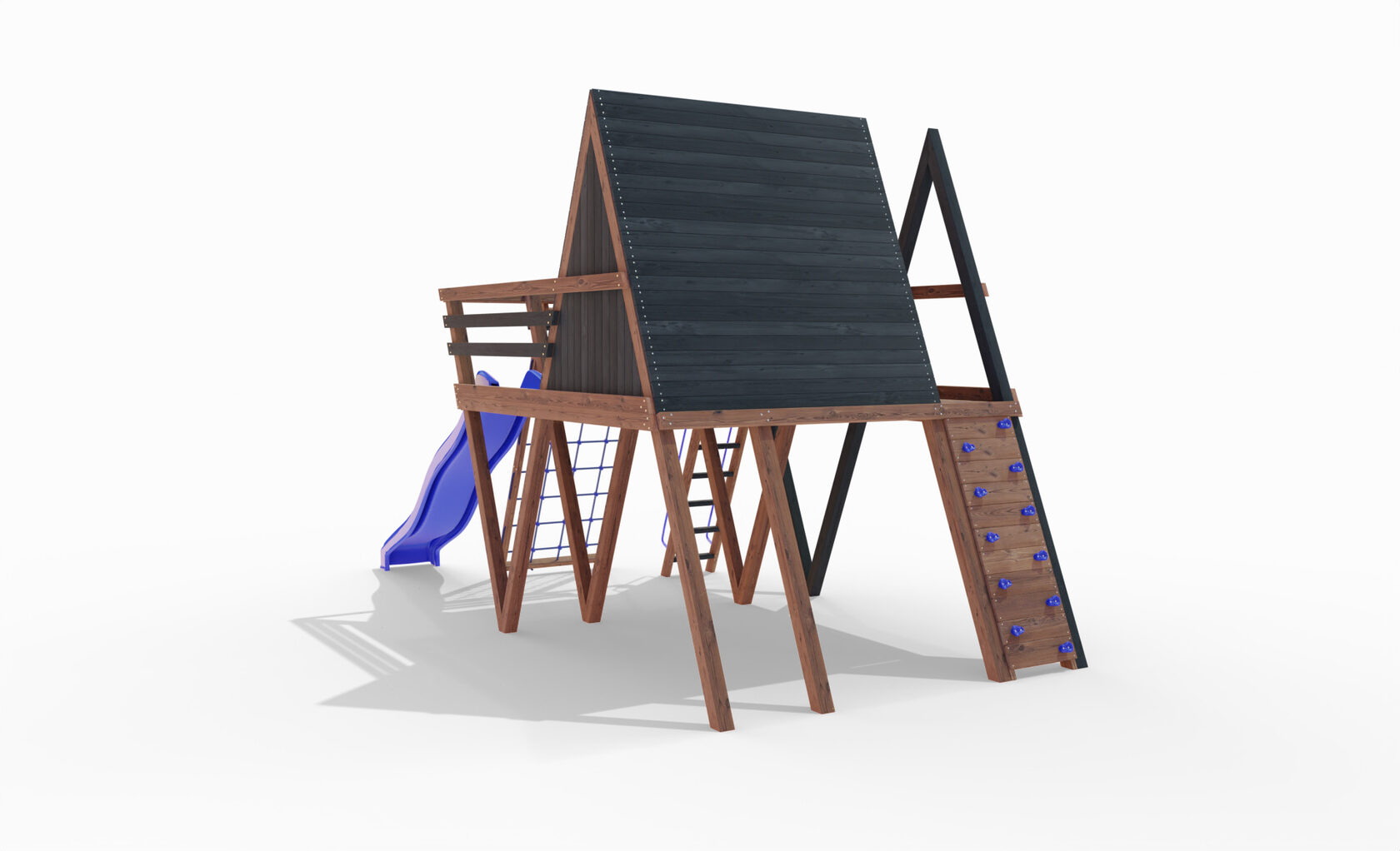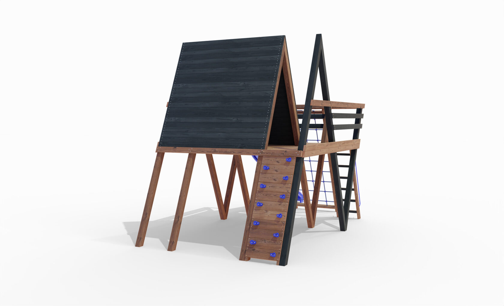 • Двухярусная платформа с высотой 2-го яруса 1500 мм от уровня земли • Домик с деревянной крышей • Лестница • Металлические перила на лестницу 2 шт. • Скалодром на крыше • Камни на скалодром - 45 шт. • Пластиковая горка длина 3 метра - 2 щт. • Инструкция • Все необходимые крепёжные элементы для сборки