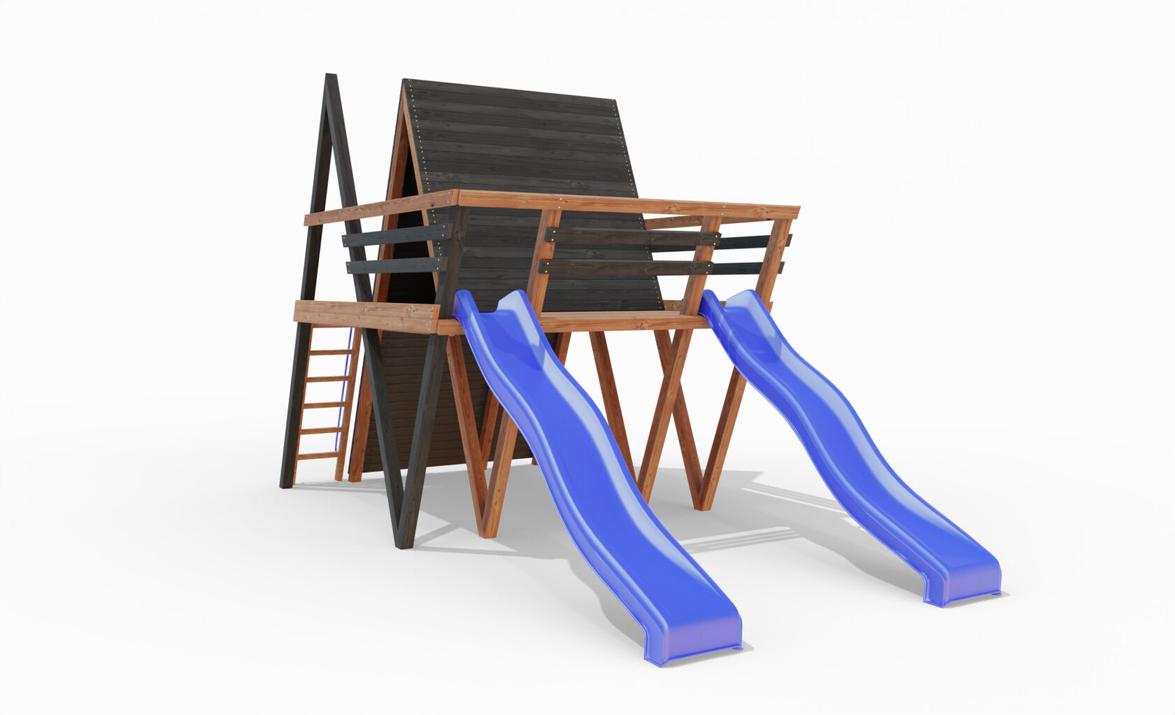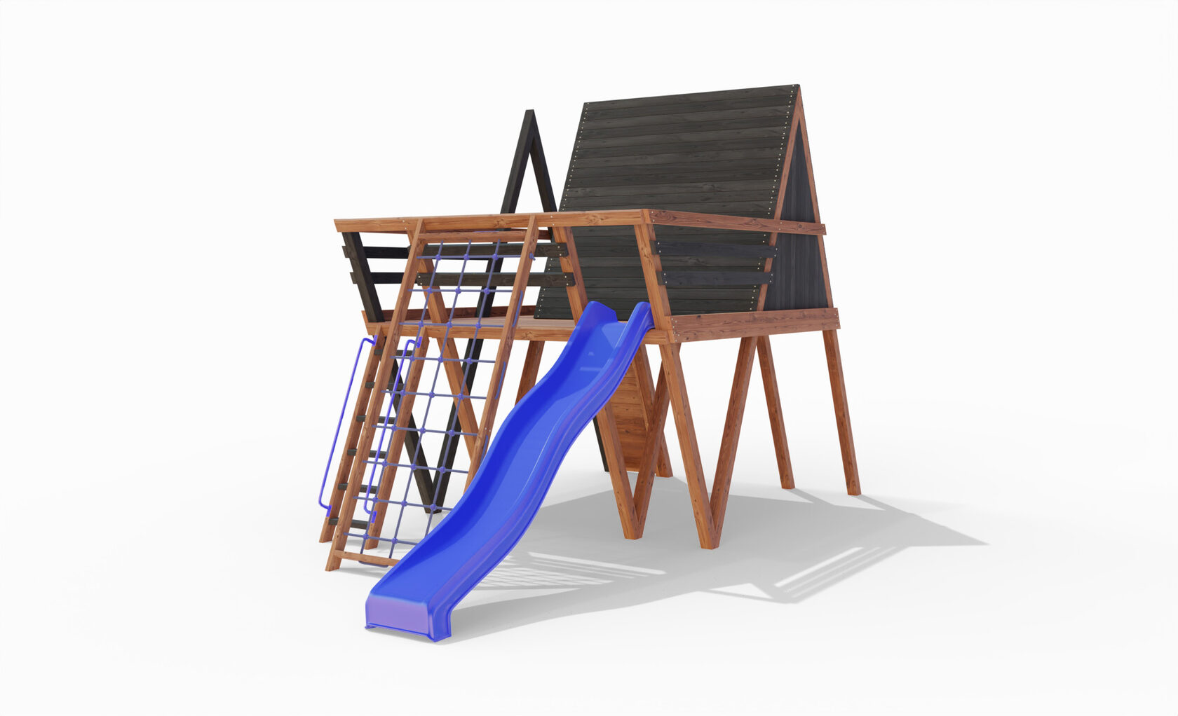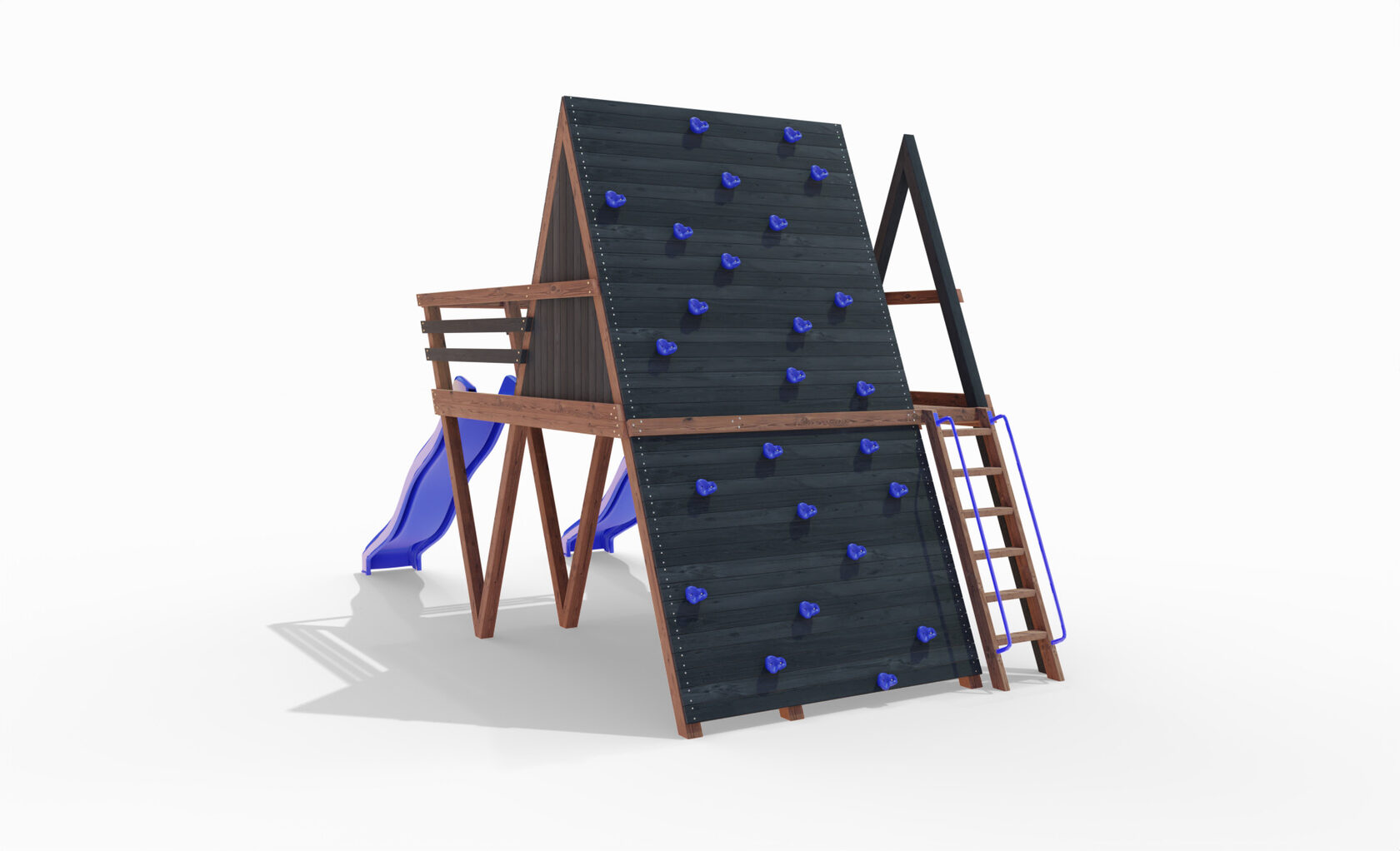 • Двухярусная платформа с высотой 2-го яруса 1500 мм от уровня земли • Домик с деревянной крышей • Лестница • Металлические перила на лестницу 2 шт. • Скалодром на крыше • Камни на скалодром - 45 шт. • Пластиковая горка длина 3 метра - 2 щт. • Инструкция • Все необходимые крепёжные элементы для сборки