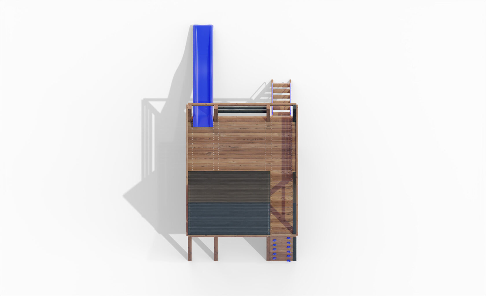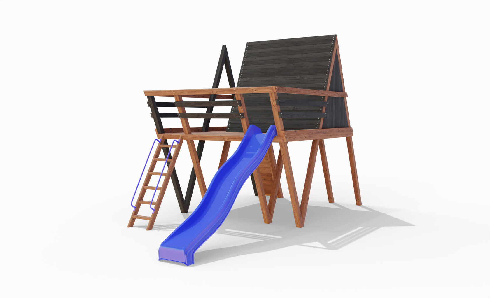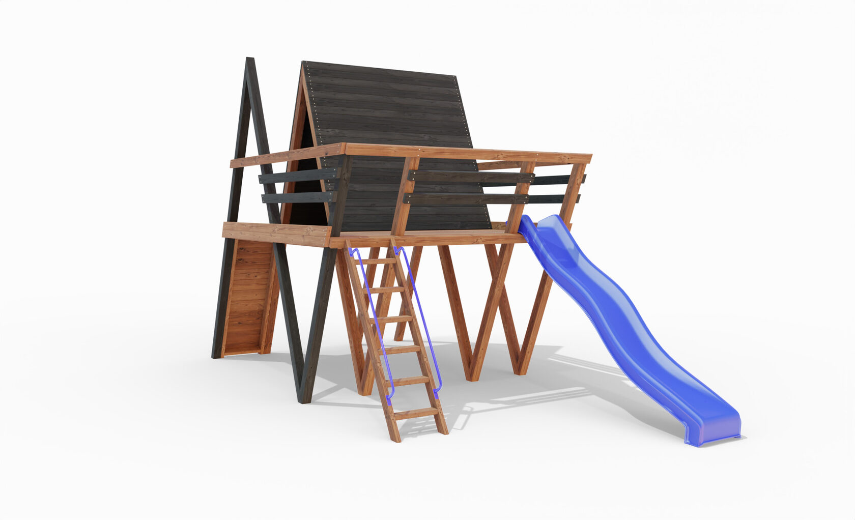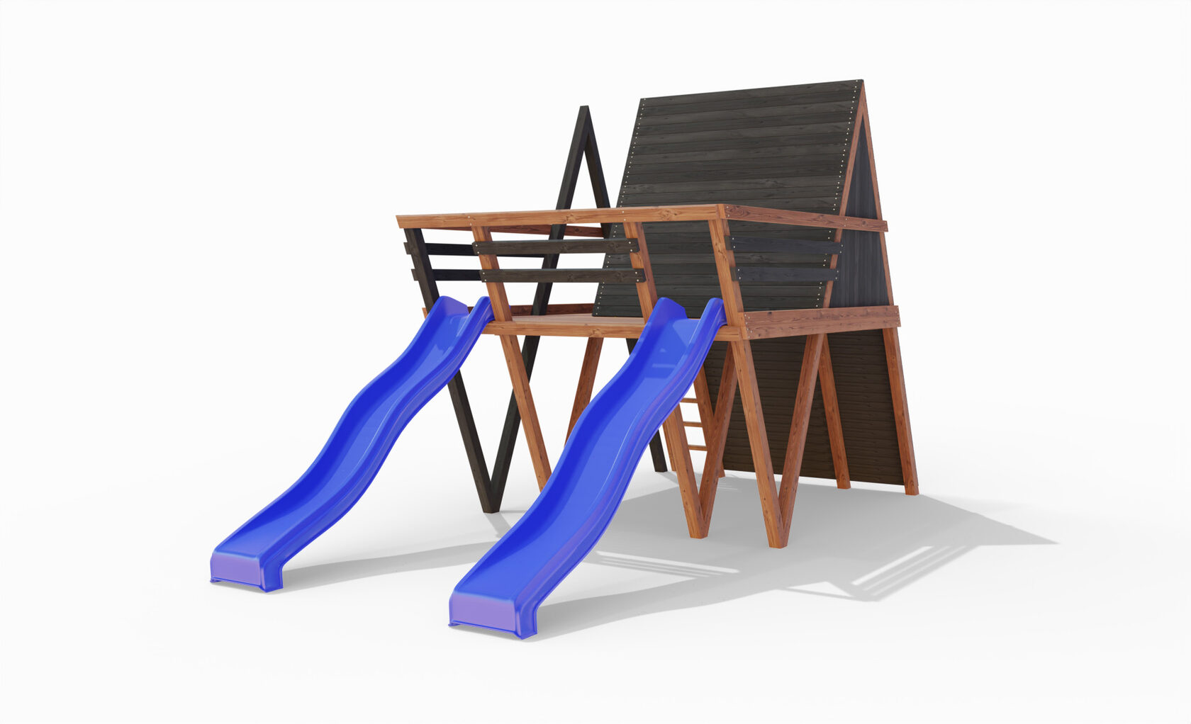 • Двухярусная платформа с высотой 2-го яруса 1500 мм от уровня земли • Домик с деревянной крышей • Лестница • Металлические перила на лестницу 2 шт. • Скалодром на крыше • Камни на скалодром - 45 шт. • Пластиковая горка длина 3 метра - 2 щт. • Инструкция • Все необходимые крепёжные элементы для сборки