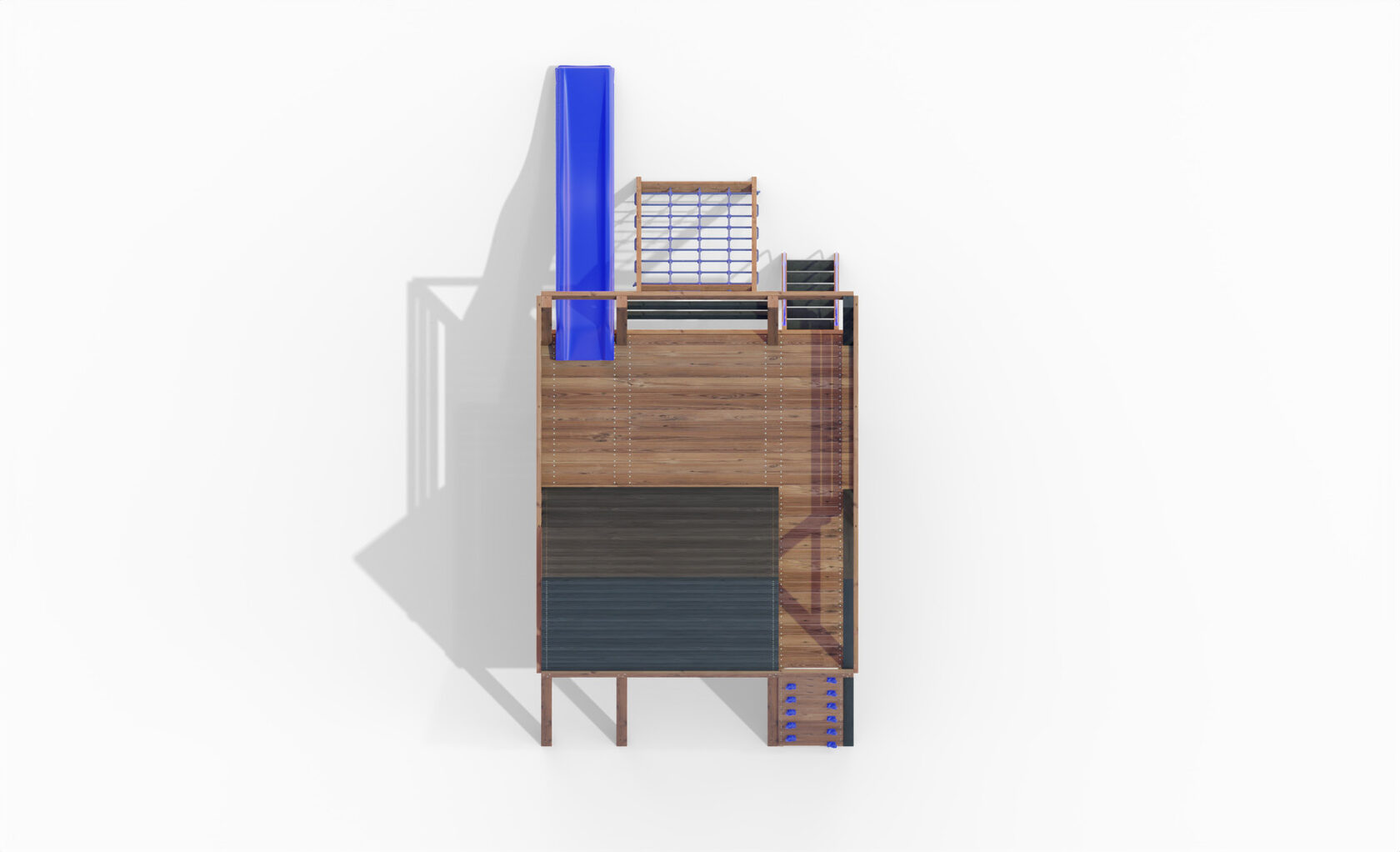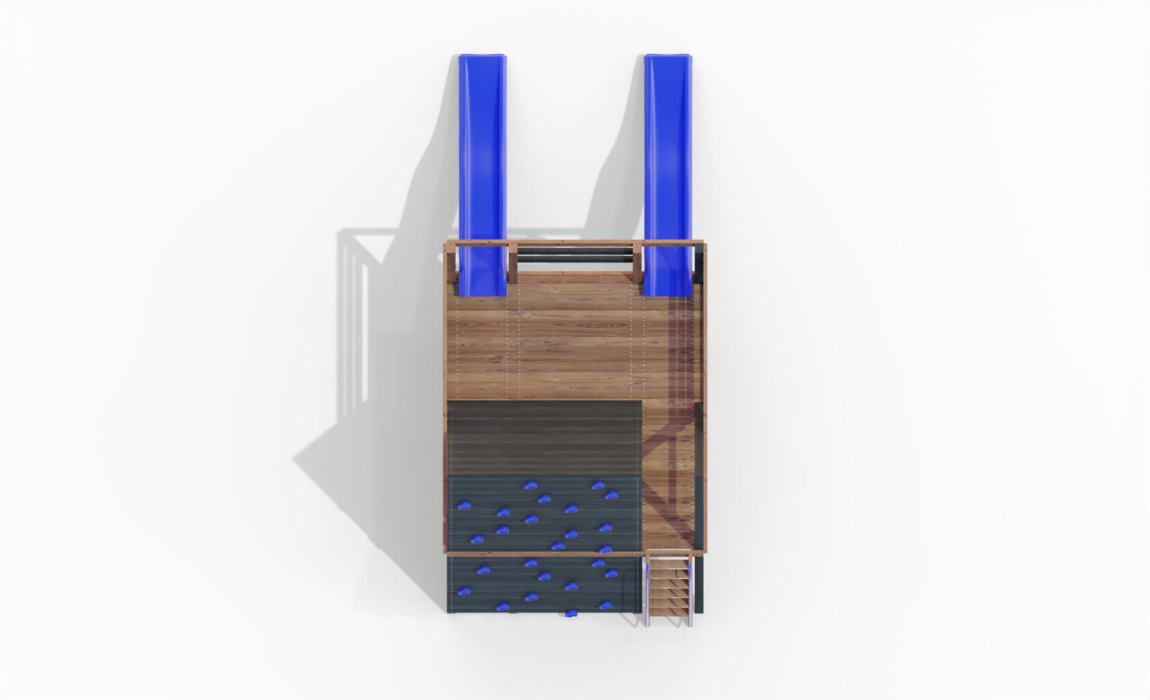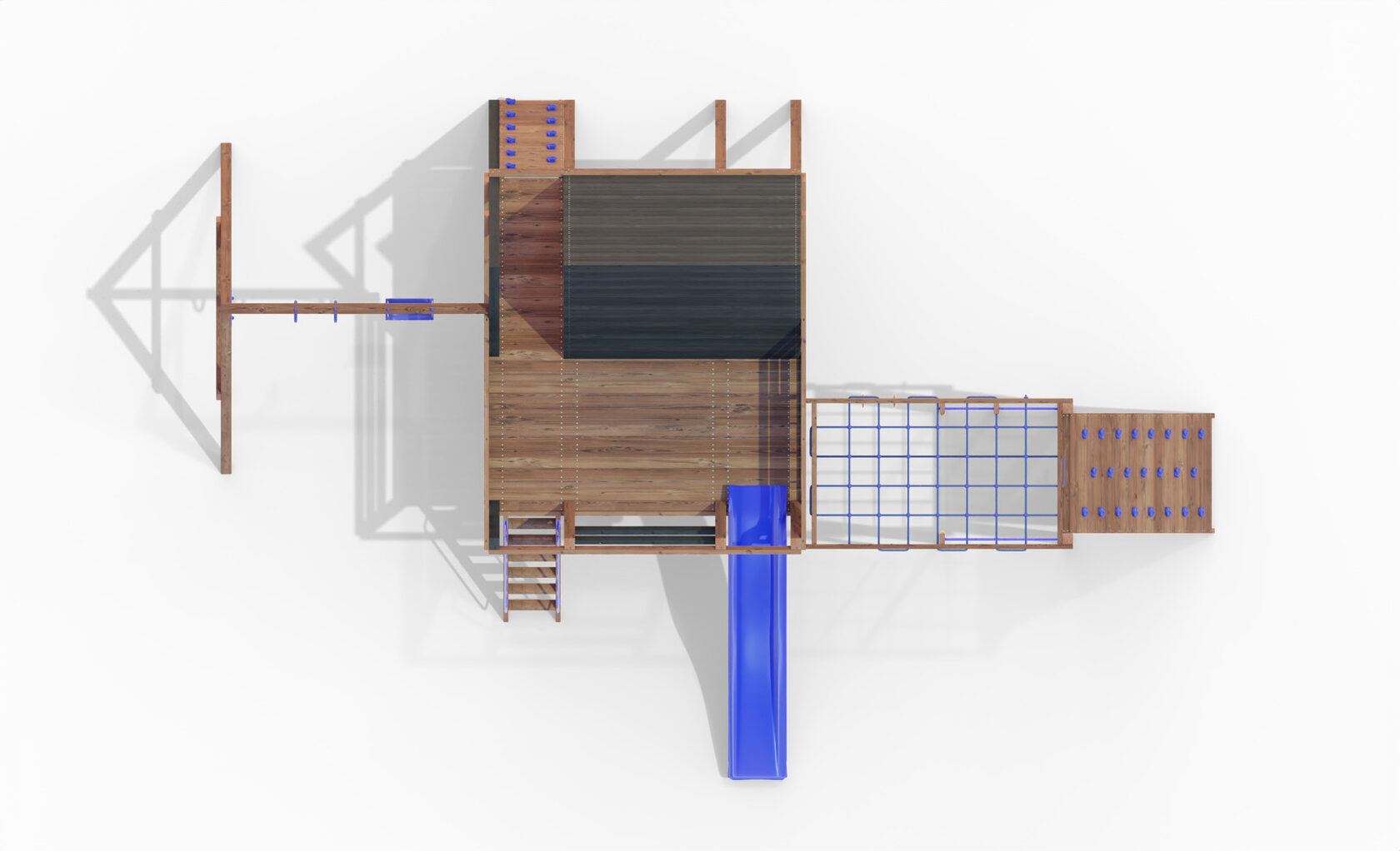 • Двухярусная платформа с высотой 2-го яруса 1500 мм от уровня земли • Домик с деревянной крышей - Лестница • Металлические перила на лестницу 2 шт. • Скалодром • Камни на скалодром - 9 шт. • Верёвочная сетка на высоту перил 2300, с канатом 16 мм • Зажимы для верёвки 27 шт. • Пластиковая горка длина 3 метра • Инструкция • Все необходимые крепёжные элементы для сборки