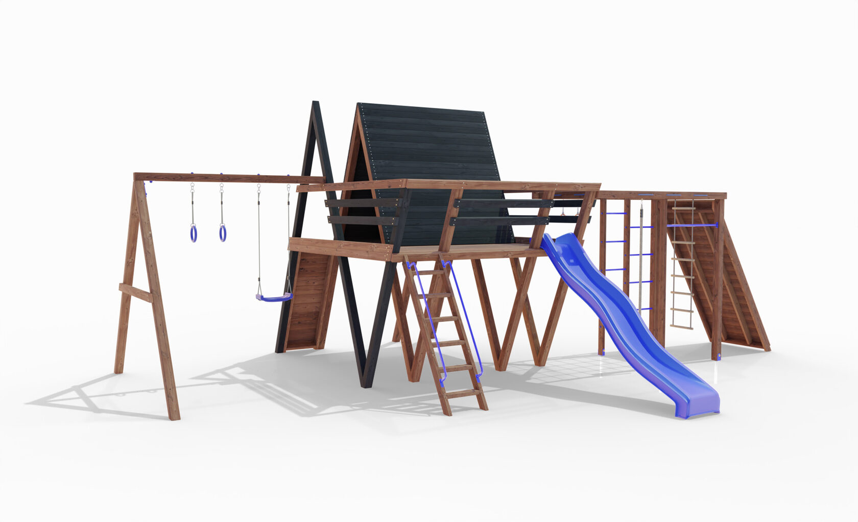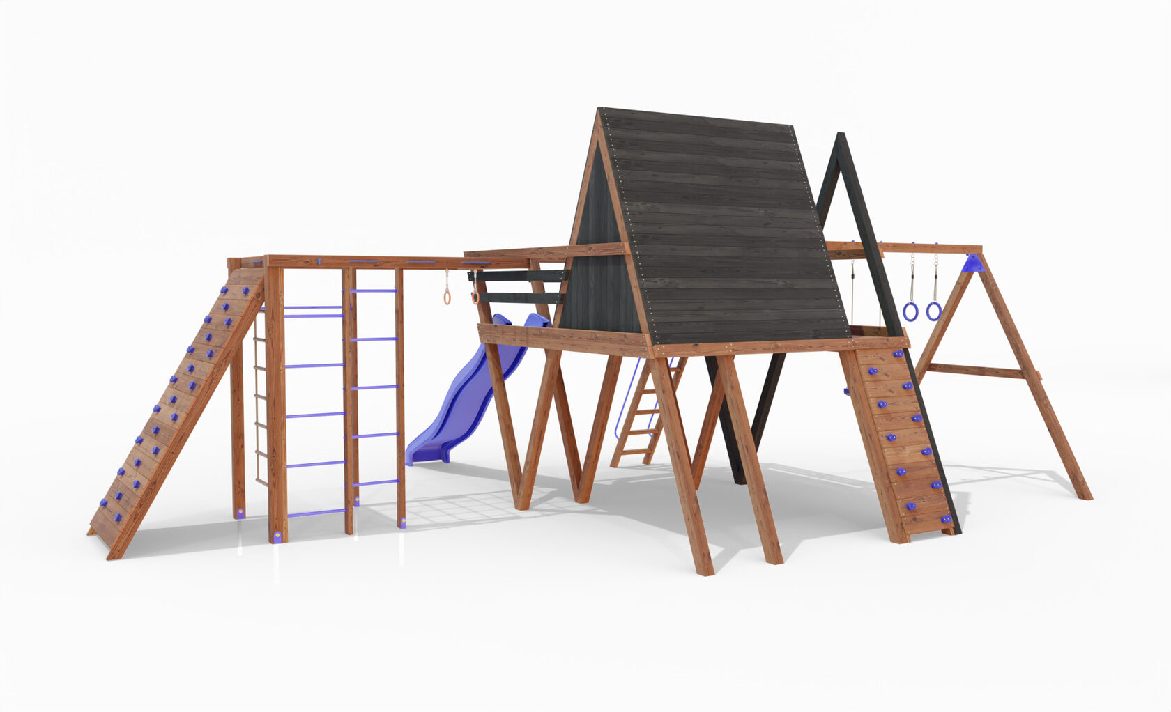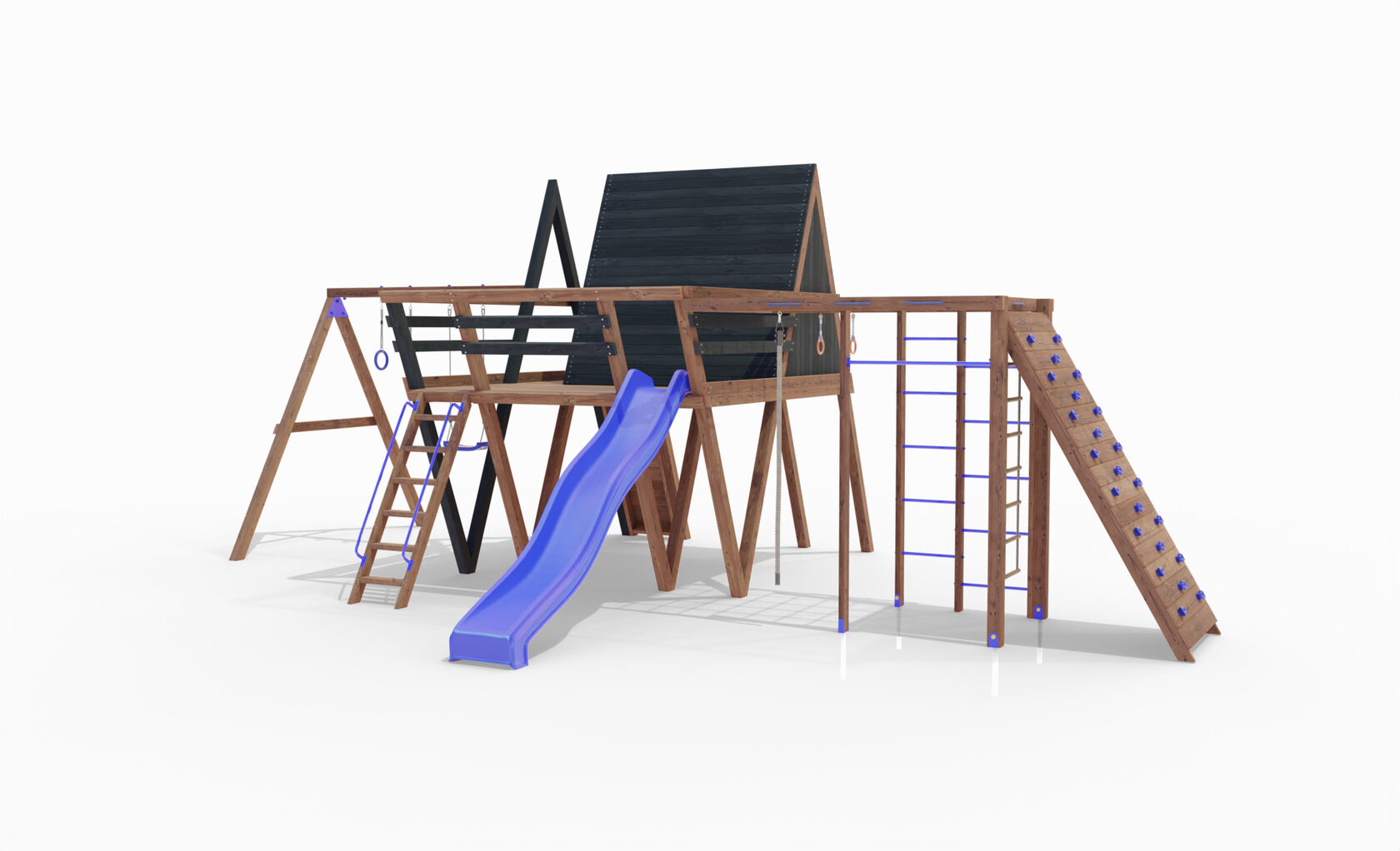 • Двухярусная платформа с высотой 2-го яруса 1500 мм от уровня земли • Домик с деревянной крышей • Лестница • Металлические перила на лестницу 2 шт. • Скалодром • Камни на скалодром - 9 шт. • Качельная балка на 3 места • Карабины с подвесами 4 шт. • Гимнастические кольца • Качели лодочка 1 шт. • Пластиковая горка длина 3 метра • Инструкция • Все необходимые крепёжные элементы для сборки