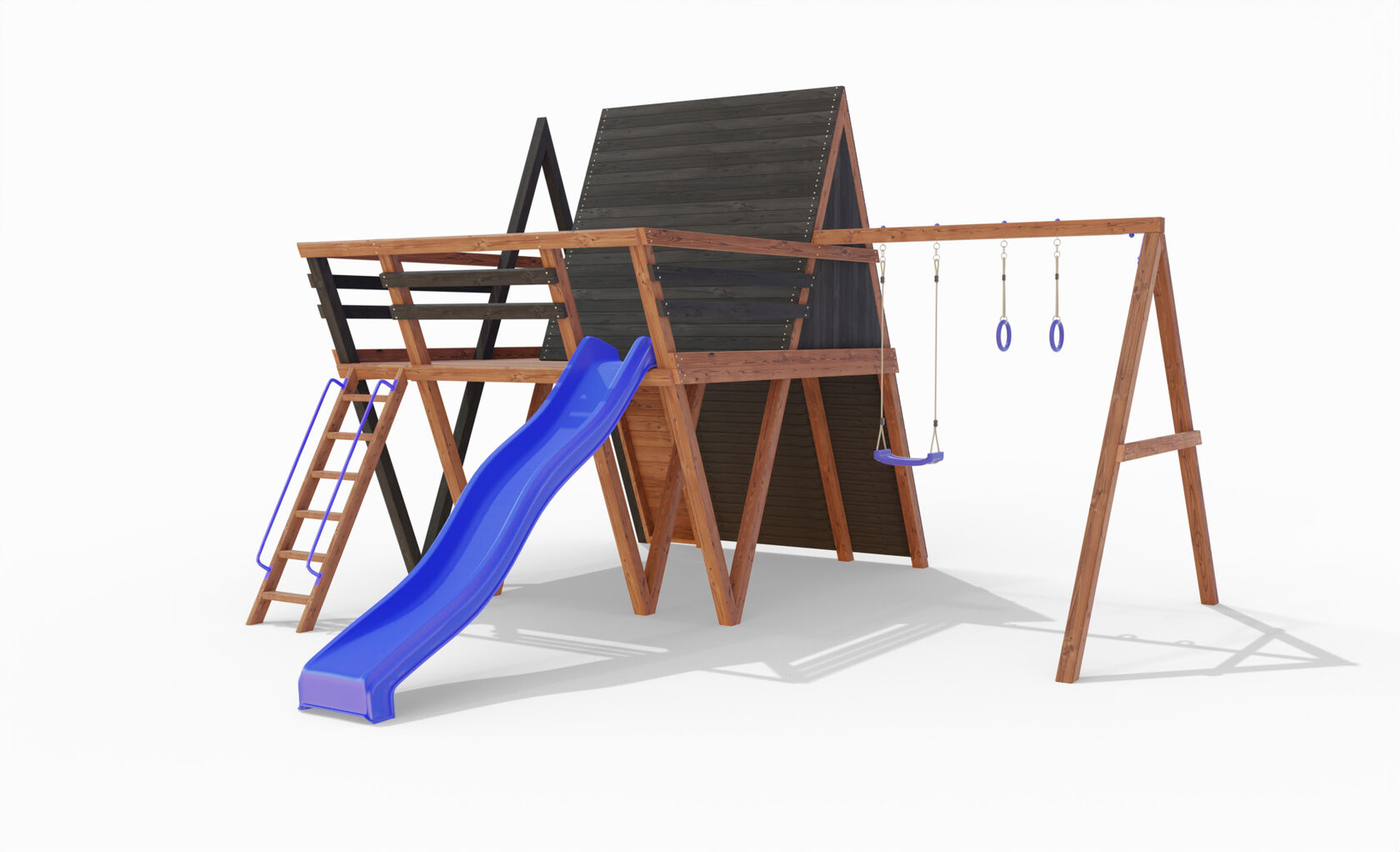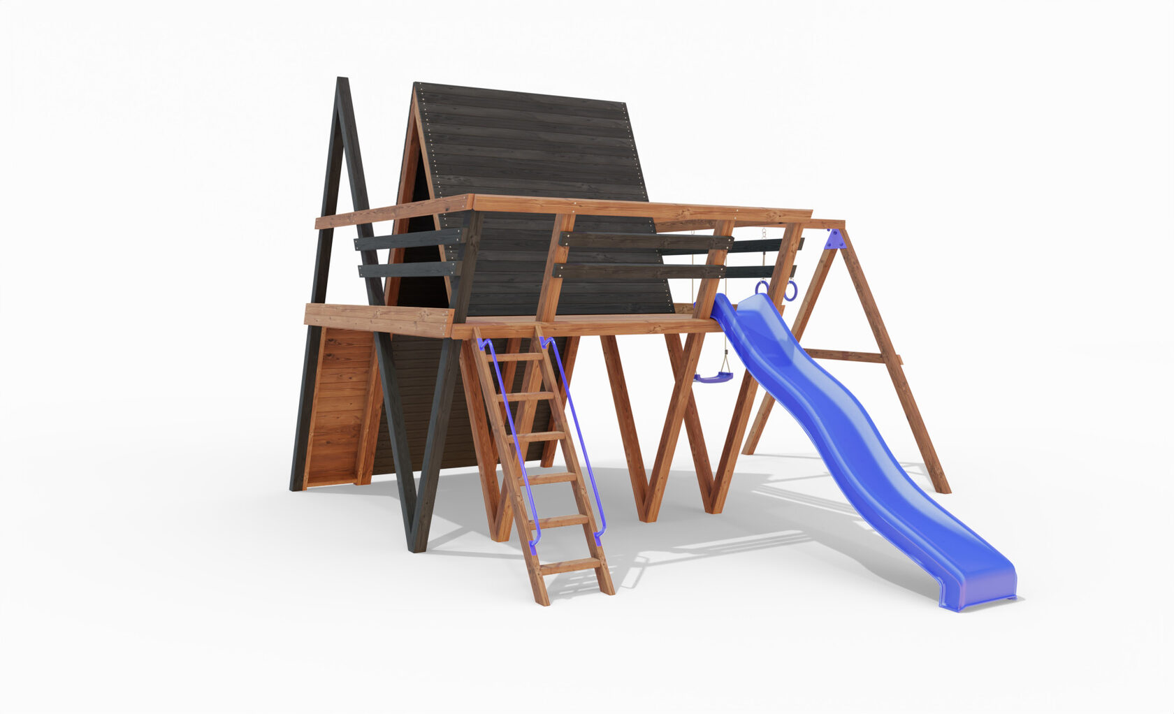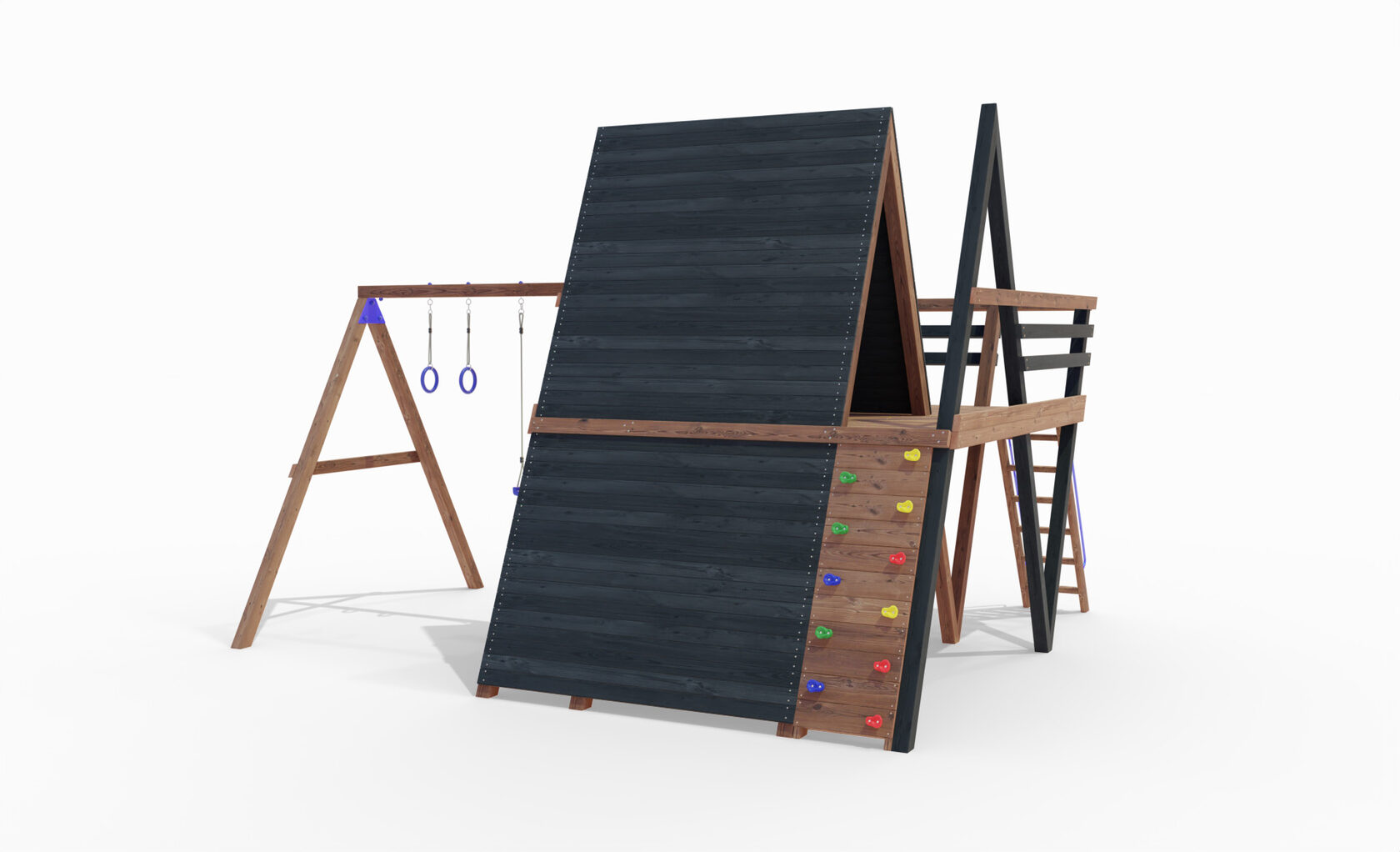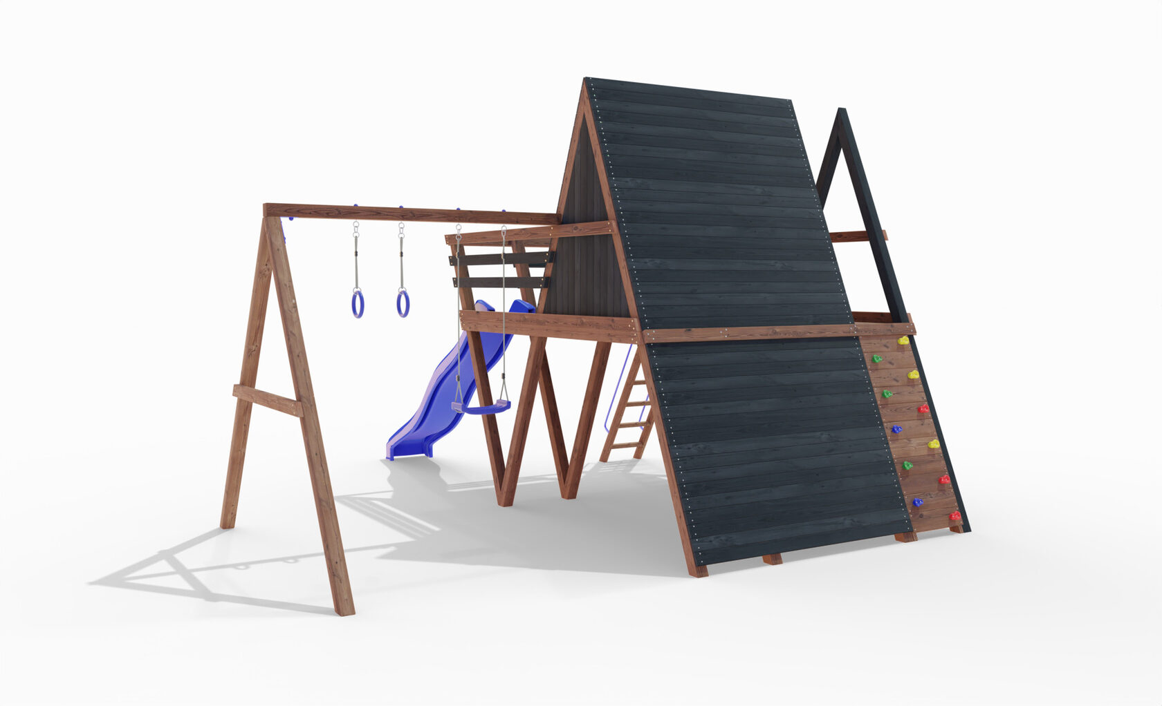 • Двухярусная платформа с высотой 2-го яруса 1500 мм от уровня земли • Домик с деревянной крышей • Лестница • Металлические перила на лестницу 2 шт. • Скалодром • Камни на скалодром - 9 шт. • Качельная балка на 3 места • Карабины с подвесами 4 шт. • Гимнастические кольца • Качели лодочка 1 шт. • Пластиковая горка длина 3 метра • Инструкция • Все необходимые крепёжные элементы для сборки