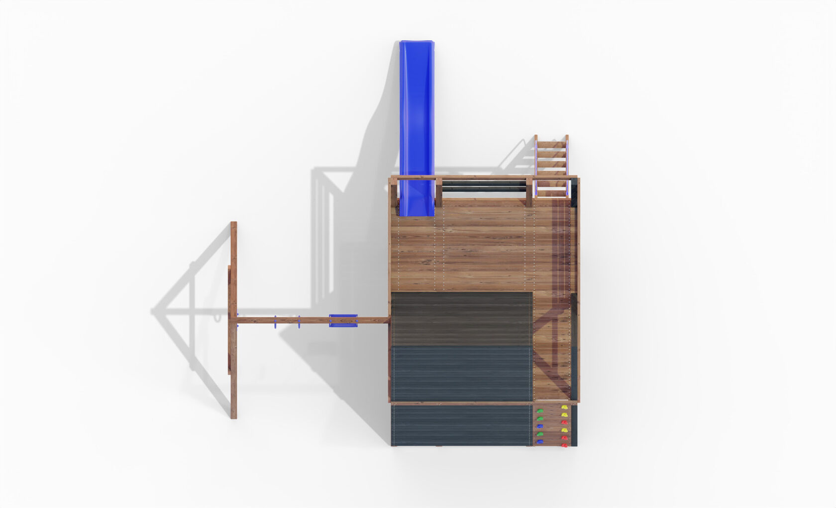 • Двухярусная платформа с высотой 2-го яруса 1500 мм от уровня земли • Домик с деревянной крышей • Лестница • Металлические перила на лестницу 2 шт. • Скалодром • Камни на скалодром - 9 шт. • Скалодром на высоту 2,3 метра • Камни на скалодром 22 шт. • Гимнастическая секция (шведская стенка, турник, гимнастические кольца, канат, верёвочная лестница, горизонтальная сетка - гамак) • Качельная балка на 3 места • Карабины с подвесами 4 шт. • Качели лодочка 1 шт. • Гимнастические кольца • Пластиковая горка длиной 3 метра • Инструкция • Все необходимые крепёжные элементы для сборки
