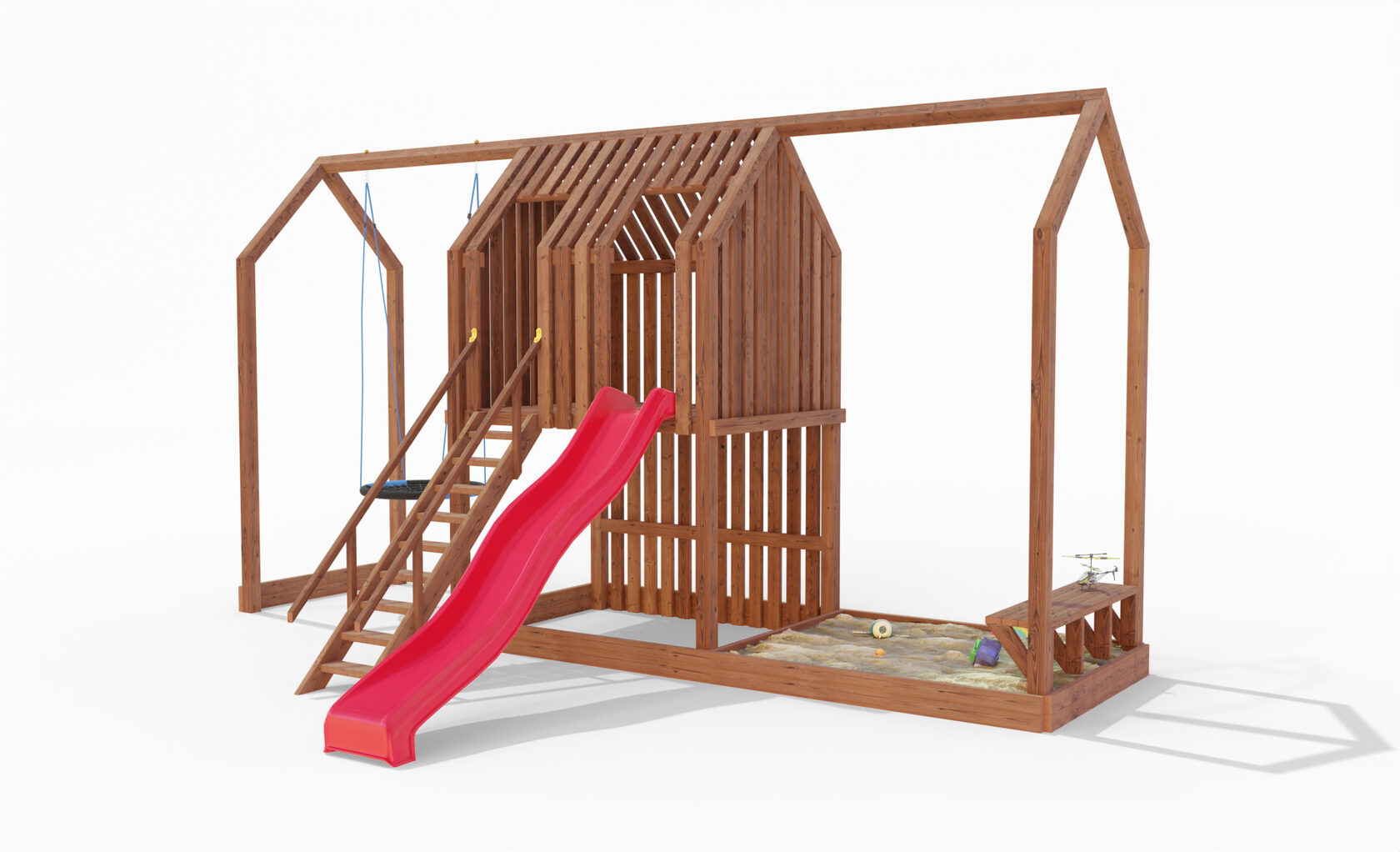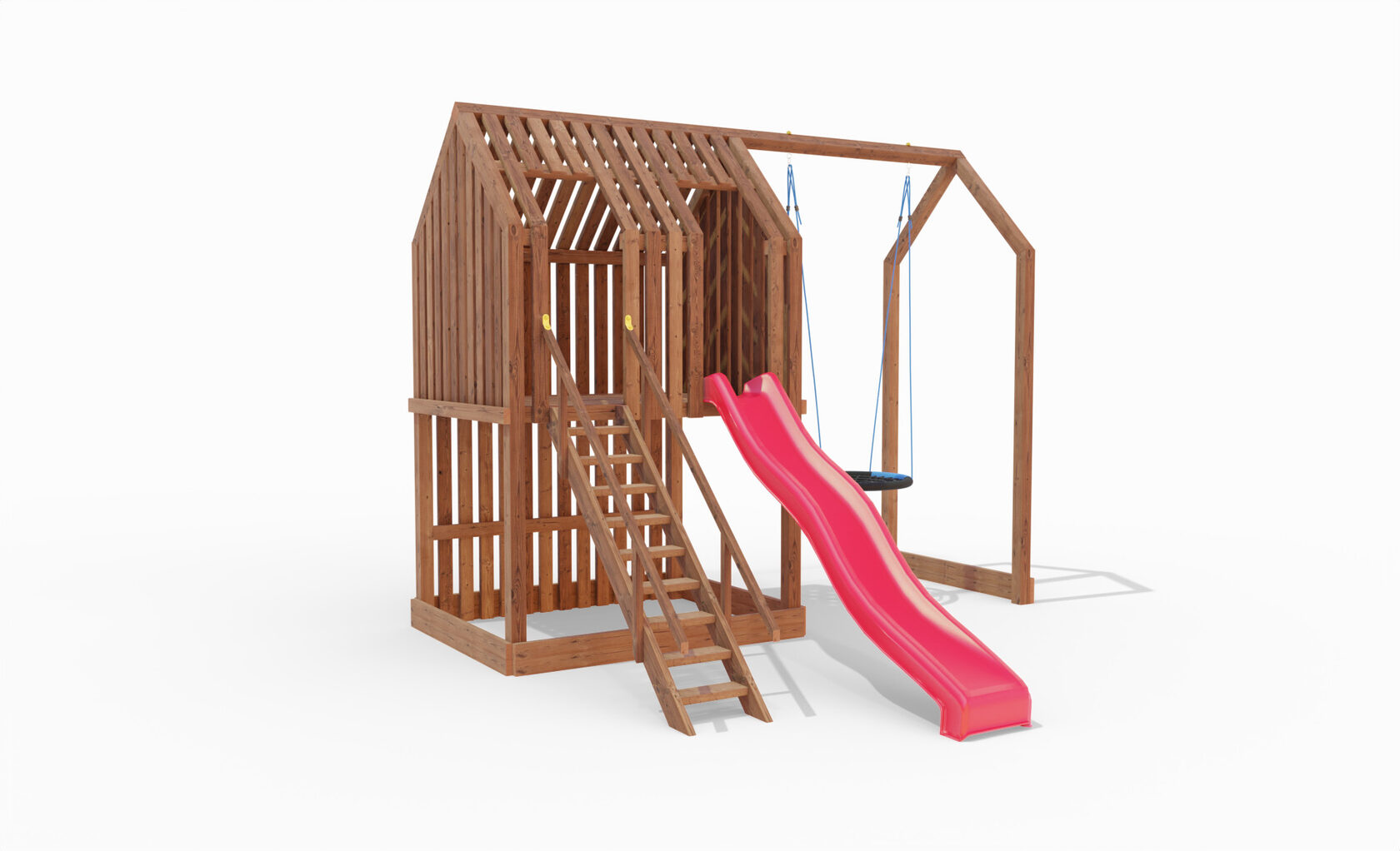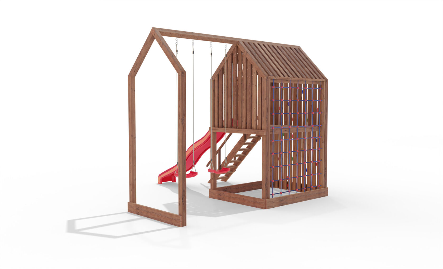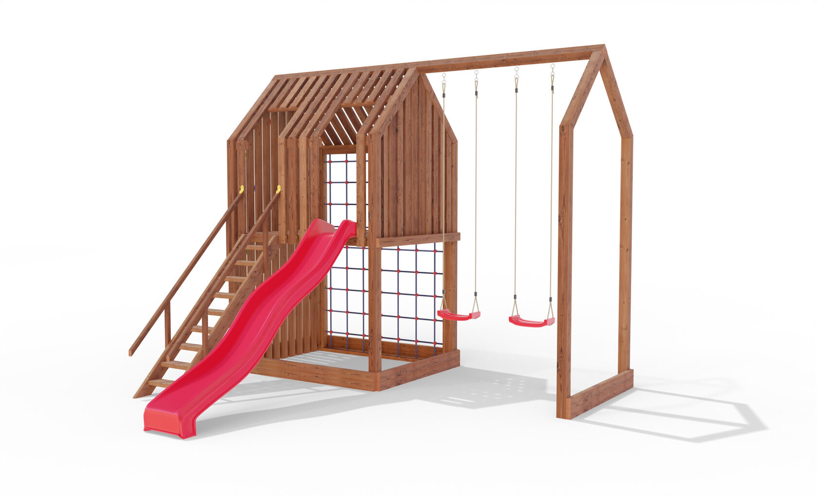 • Башня 1,92*1,6 высота пола 1,5 метра • Деревянная крыша • Лестница пологая угол наклона 45 градусов • Качельная балка на 2 места • Карабины с подвесами 4 шт. • Пластиковая горка длина 3 метра • Инструкция • Все необходимые крепёжные элеиенты для сборки