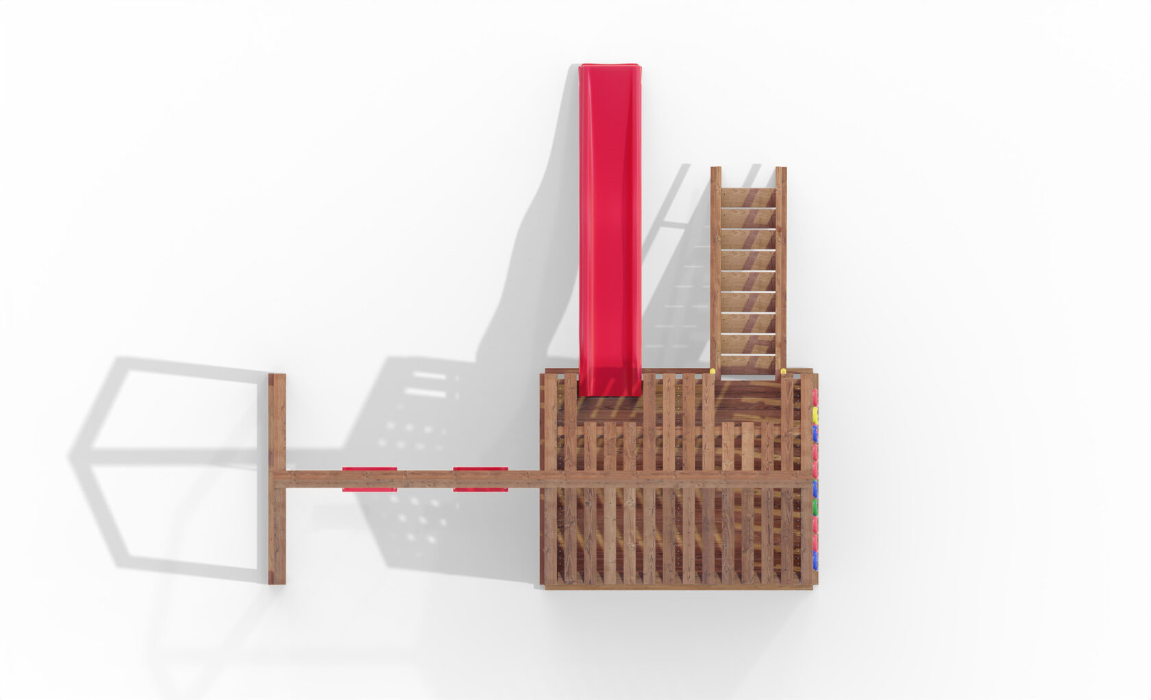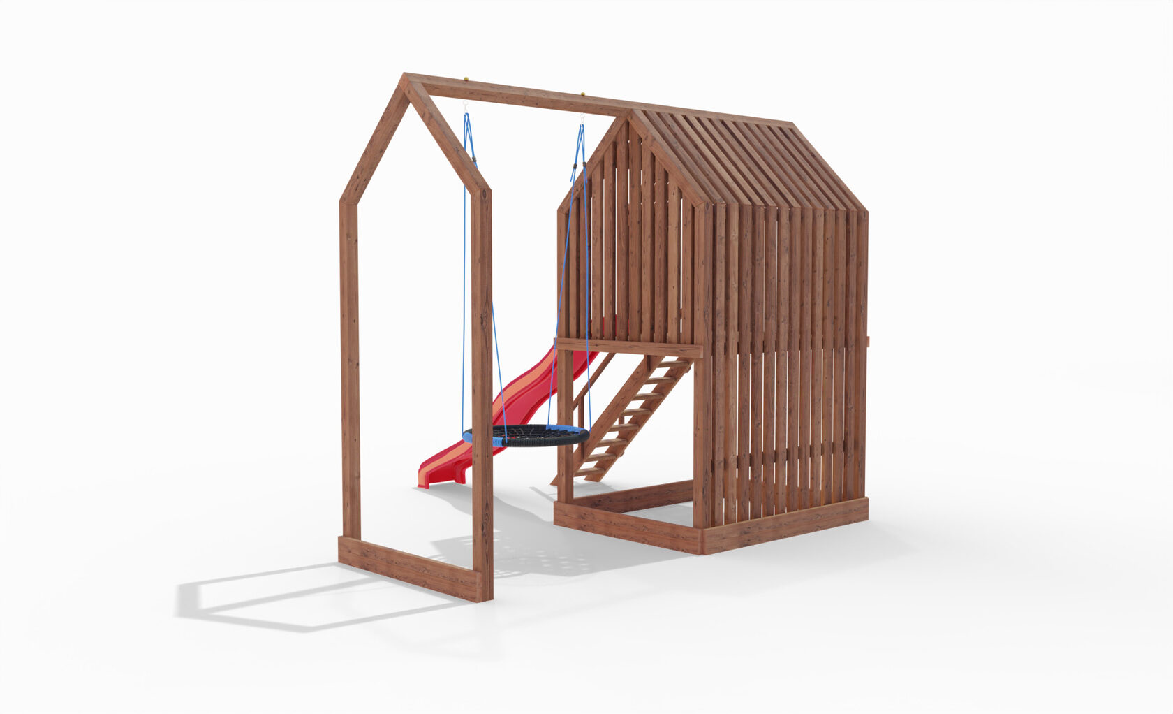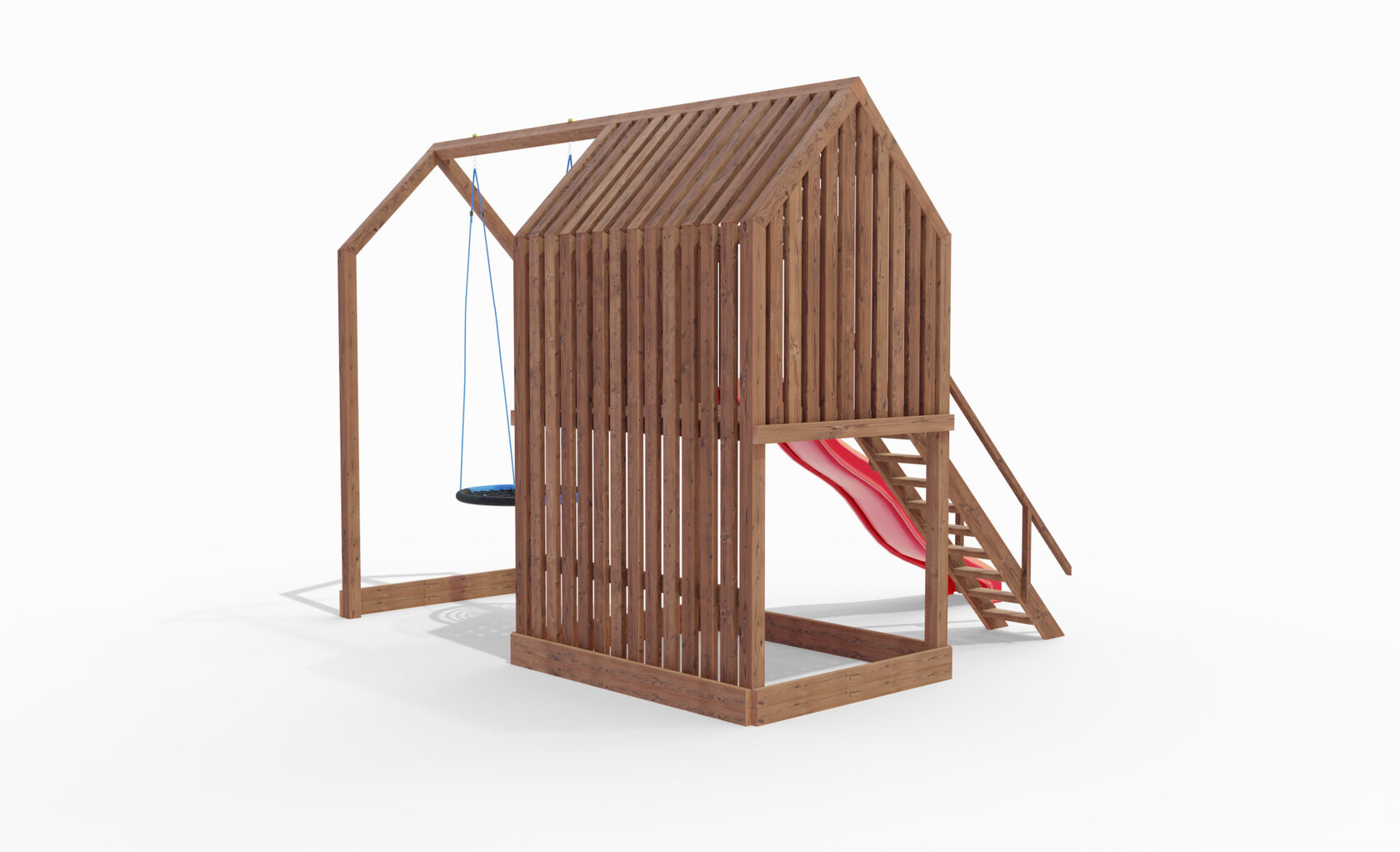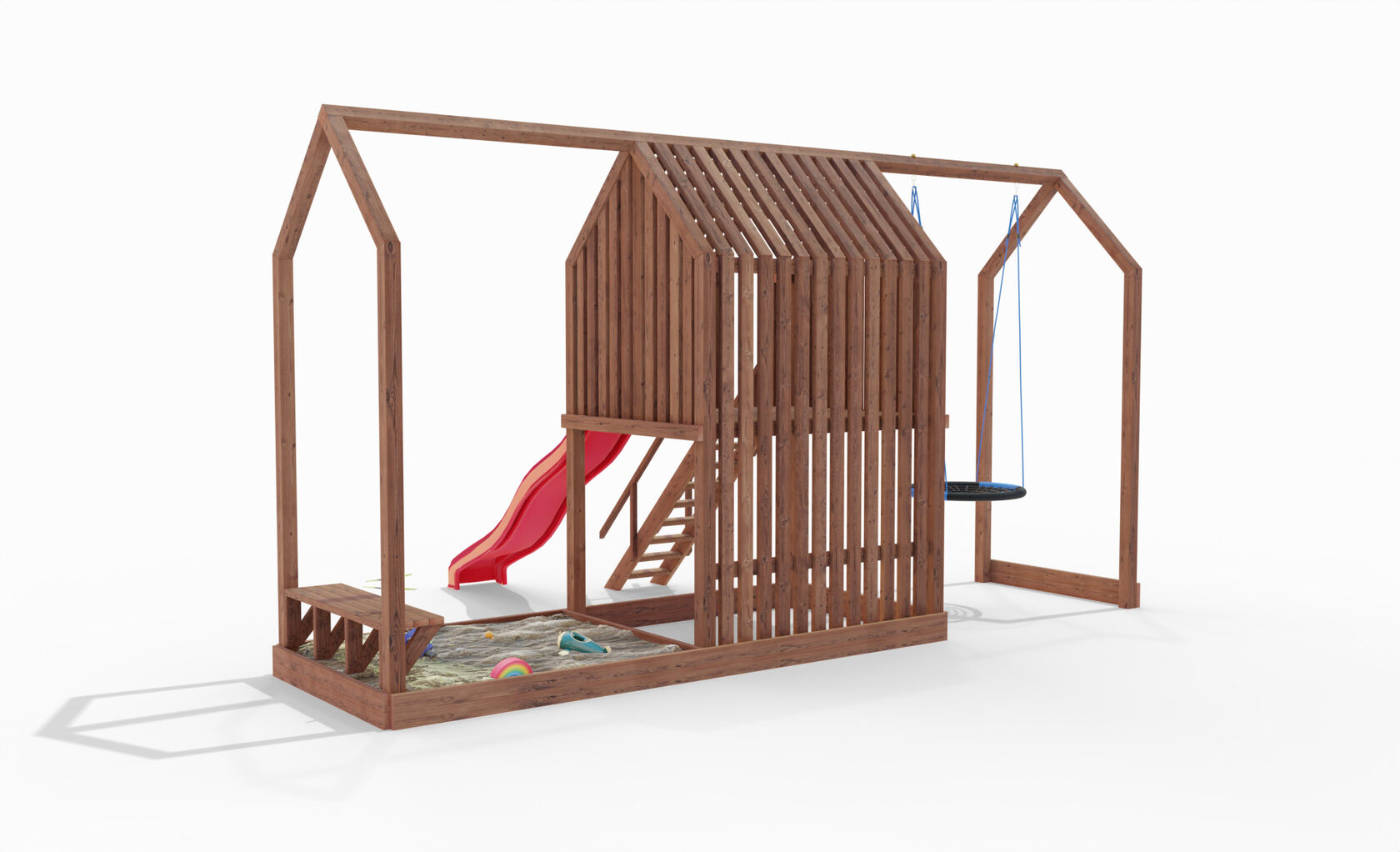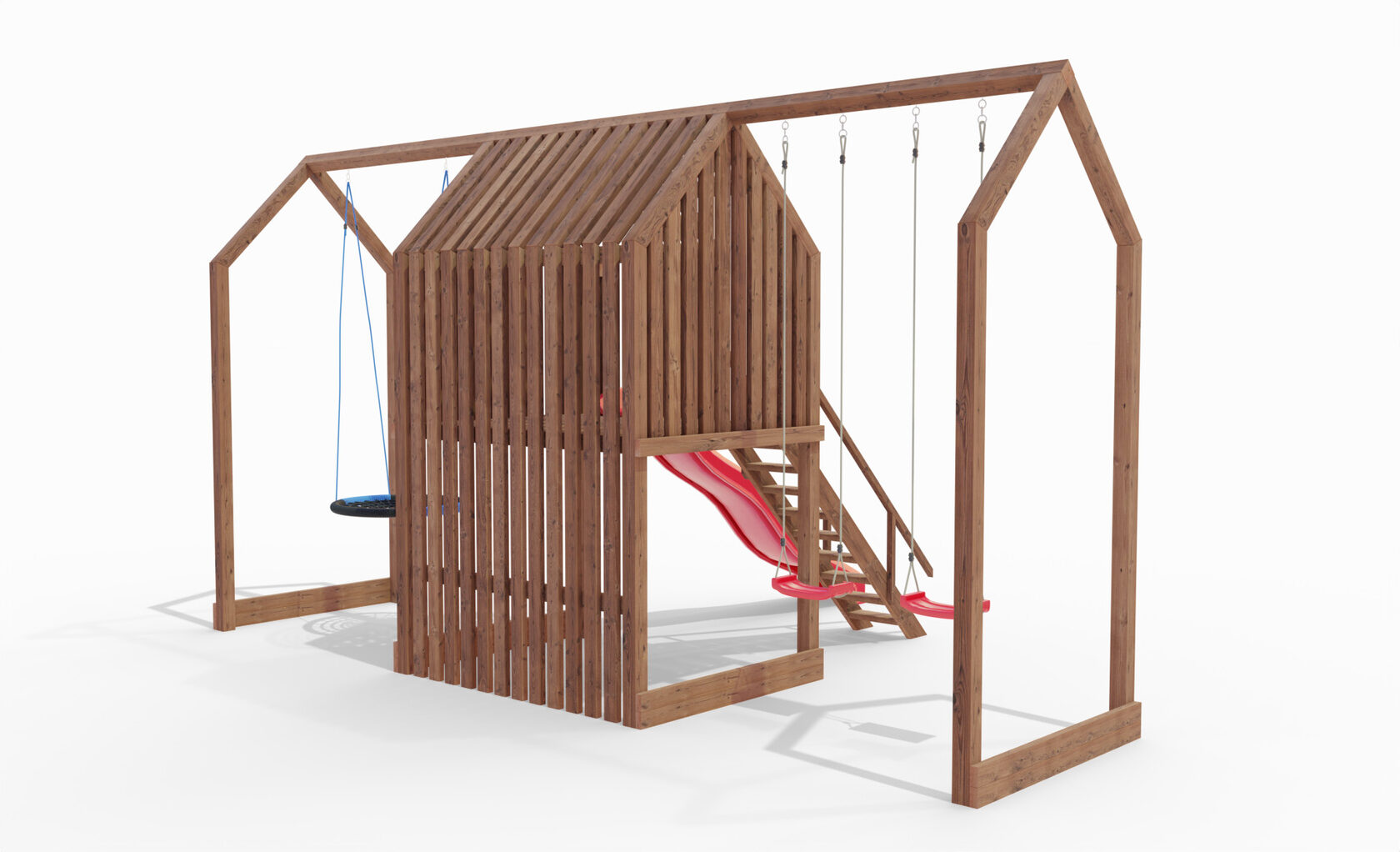 • Башня 1,92*1,6 высота пола 1,5 метра • Деревянная крыша • Лестница пологая угол наклона 45 градусов • Качельная балка на 2 места • Карабины с подвесами 4 шт. • Пластиковая горка длина 3 метра • Инструкция • Все необходимые крепёжные элеиенты для сборки