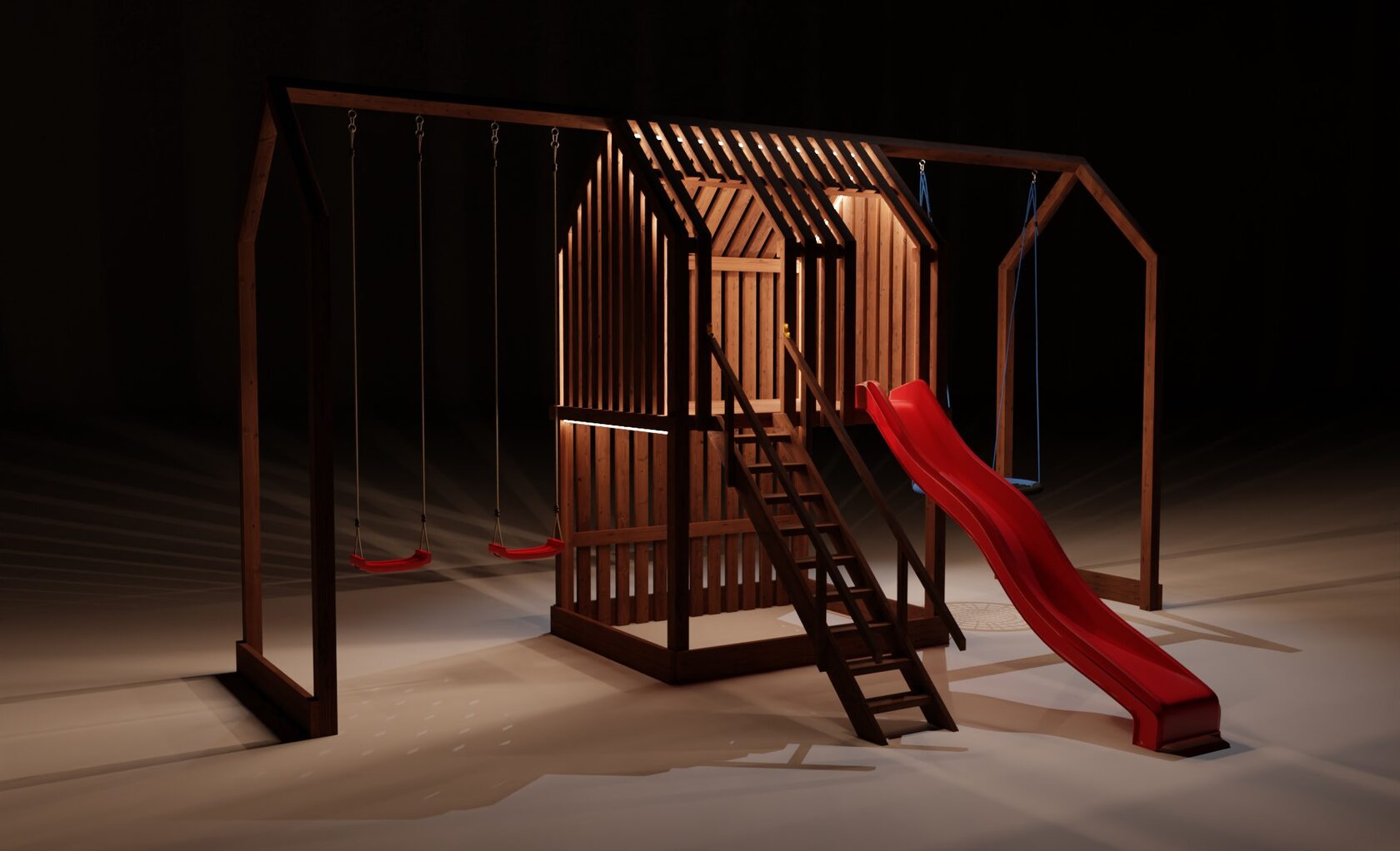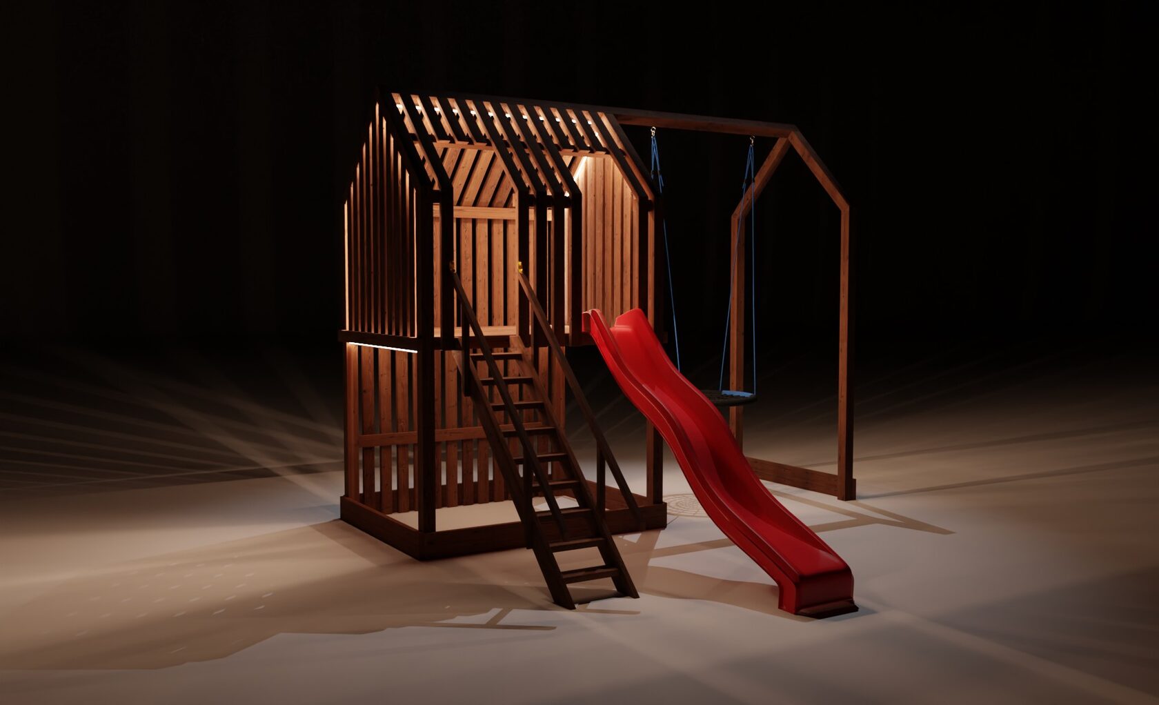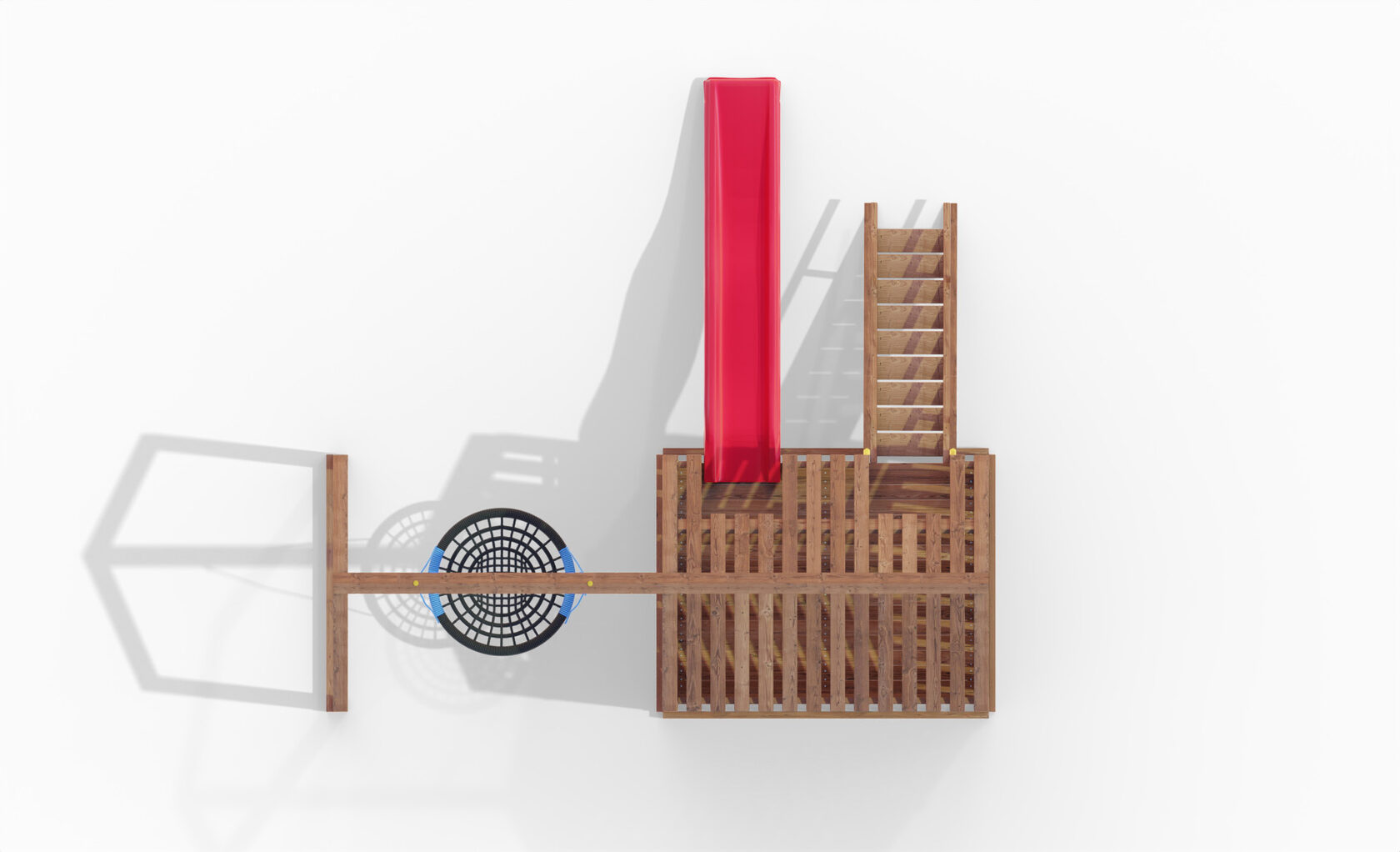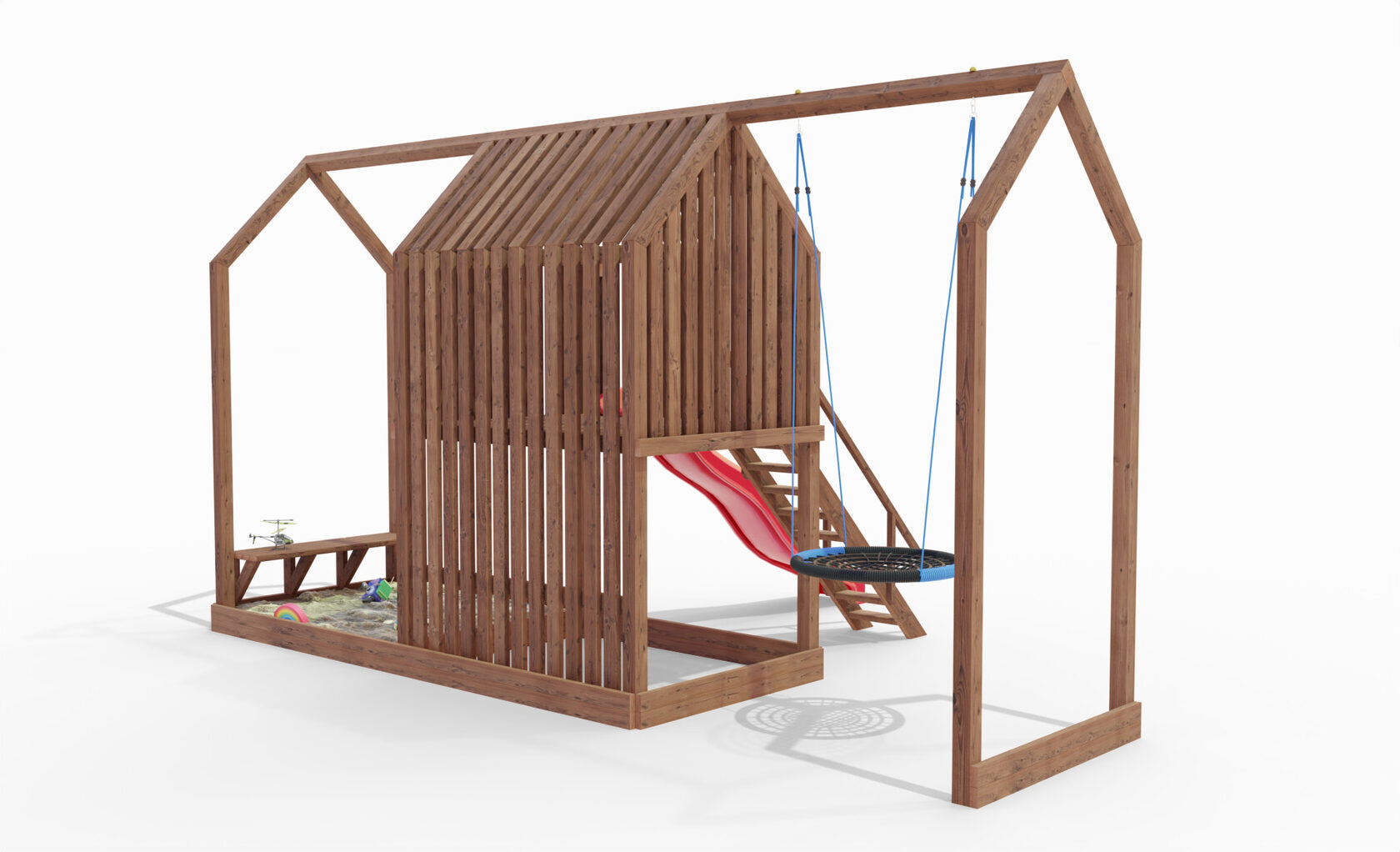 • Башня 1,92*1,6 высота пола 1,5 метра • Деревянная крыша • Лестница пологая угол наклона 45 градусов • Качельная балка на 2 места • Карабины с подвесами 4 шт. • Пластиковая горка длина 3 метра • Инструкция • Все необходимые крепёжные элеиенты для сборки
