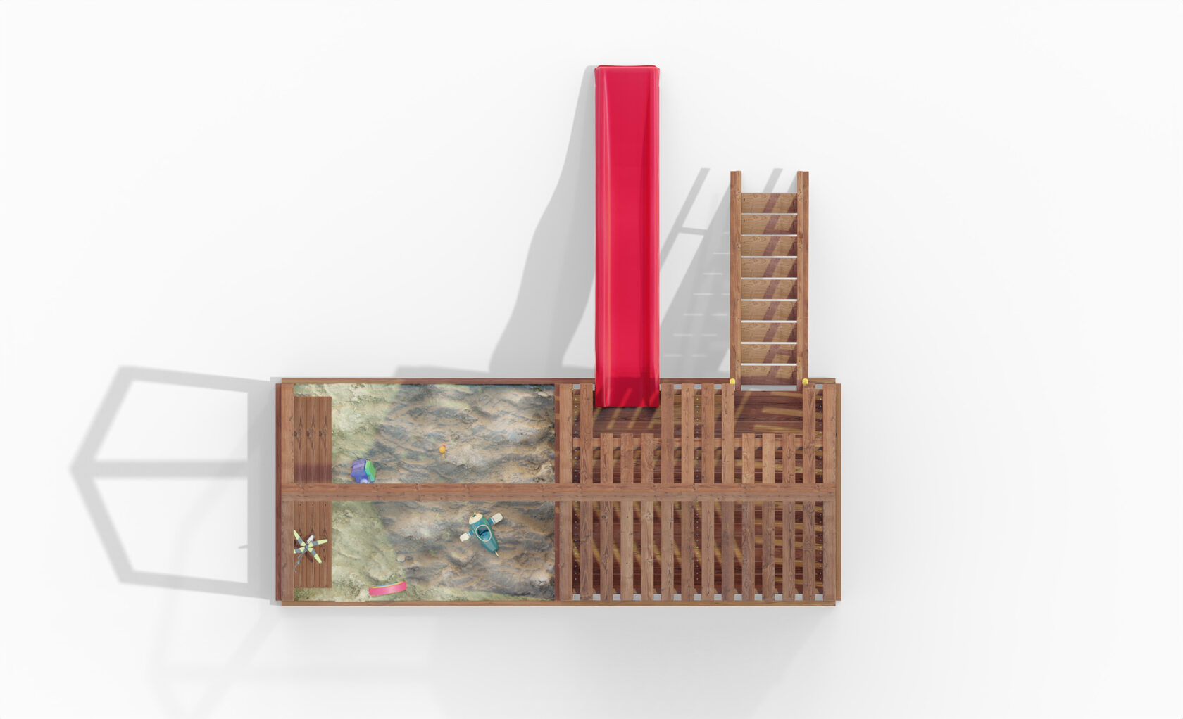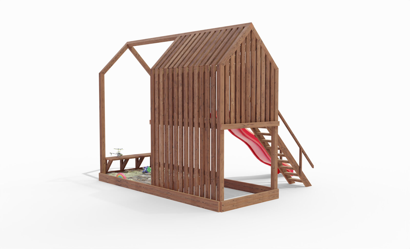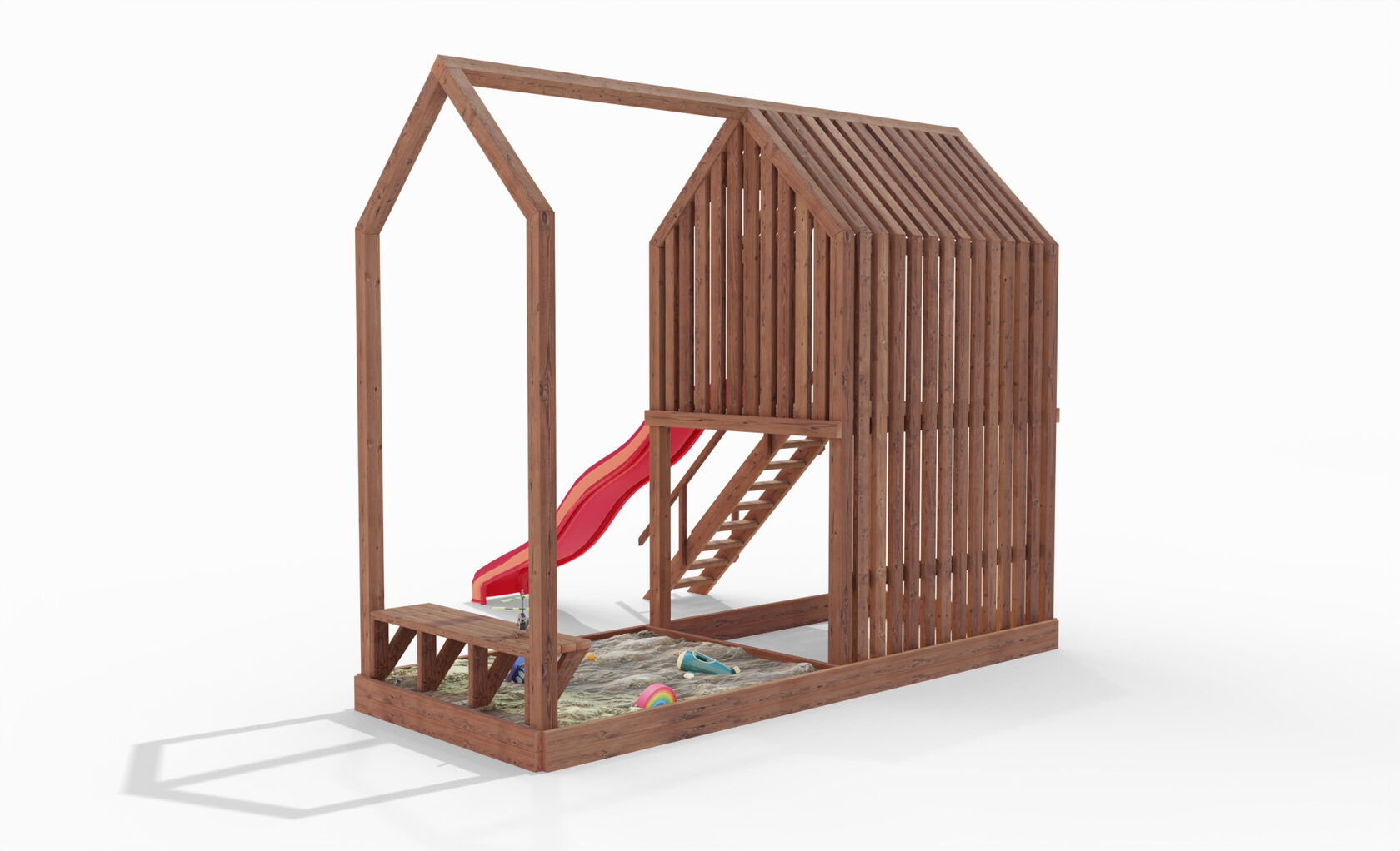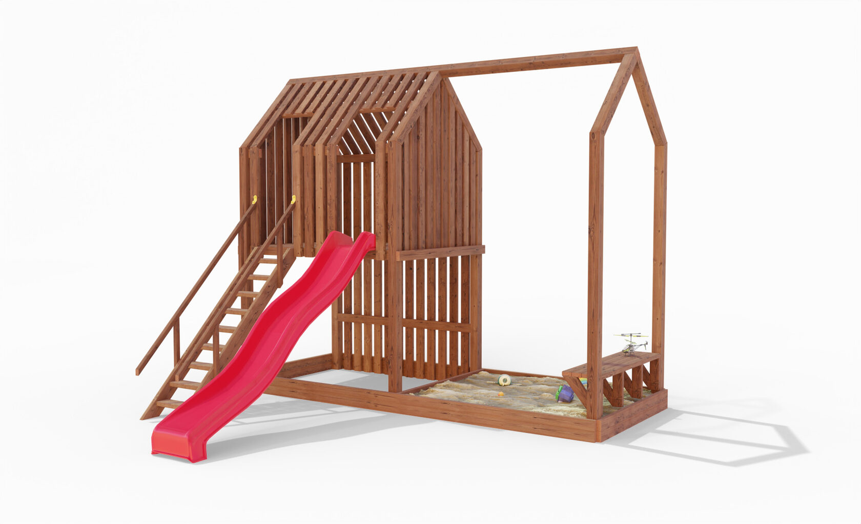 • Башня 1,92*1,6 высота пола 1,5 метра • Деревянная крыша • Лестница пологая угол наклона 45 градусов • Песочница • Лавочка в песочницу • Пластиковая горка длина 3 метра • Инструкция • Все необходимые крепёжные элементы для сборки