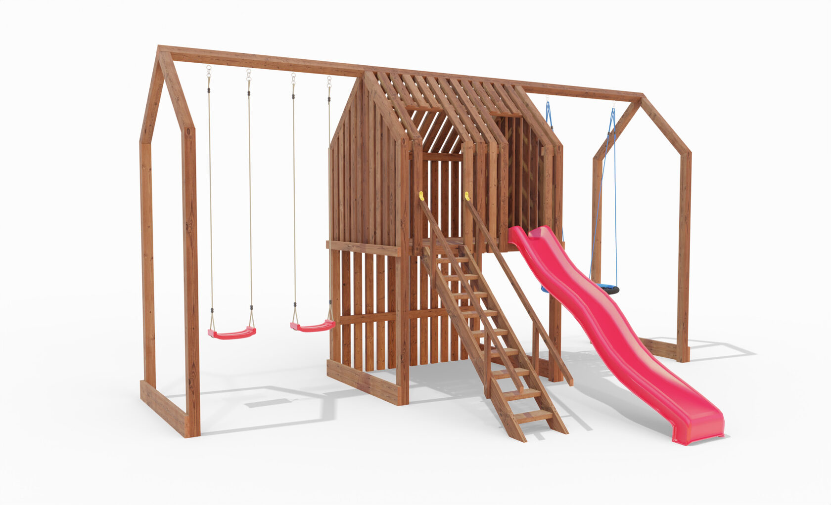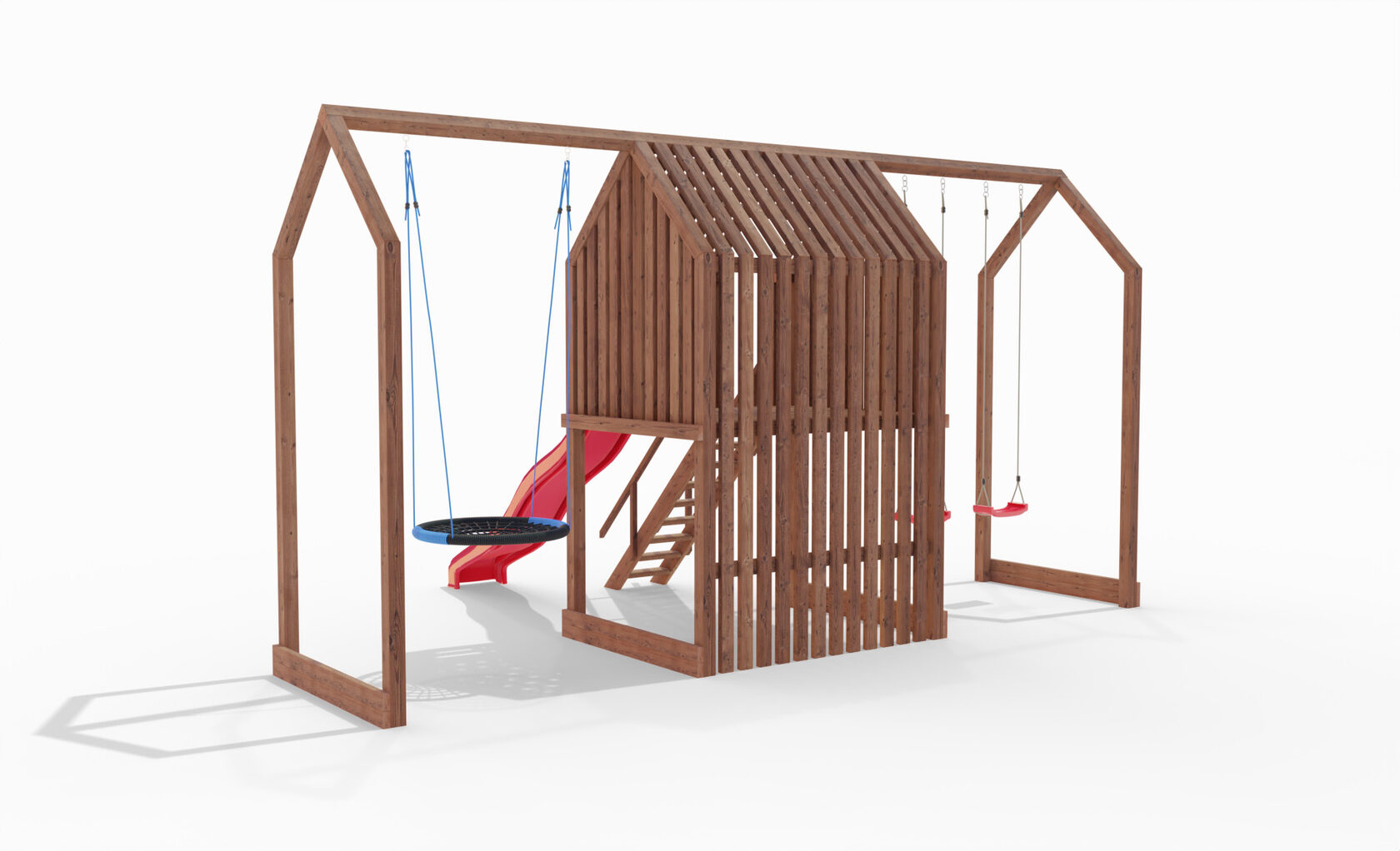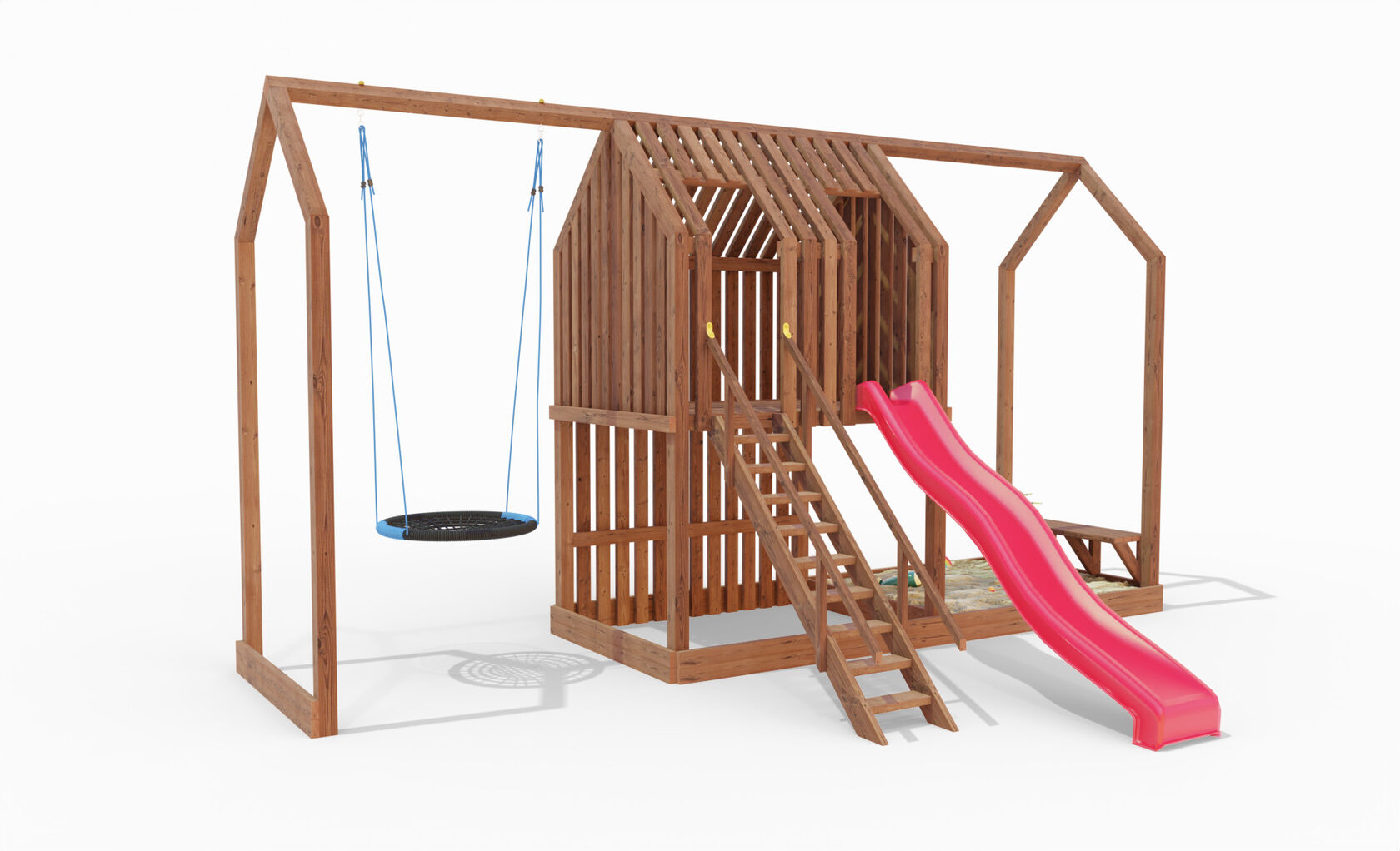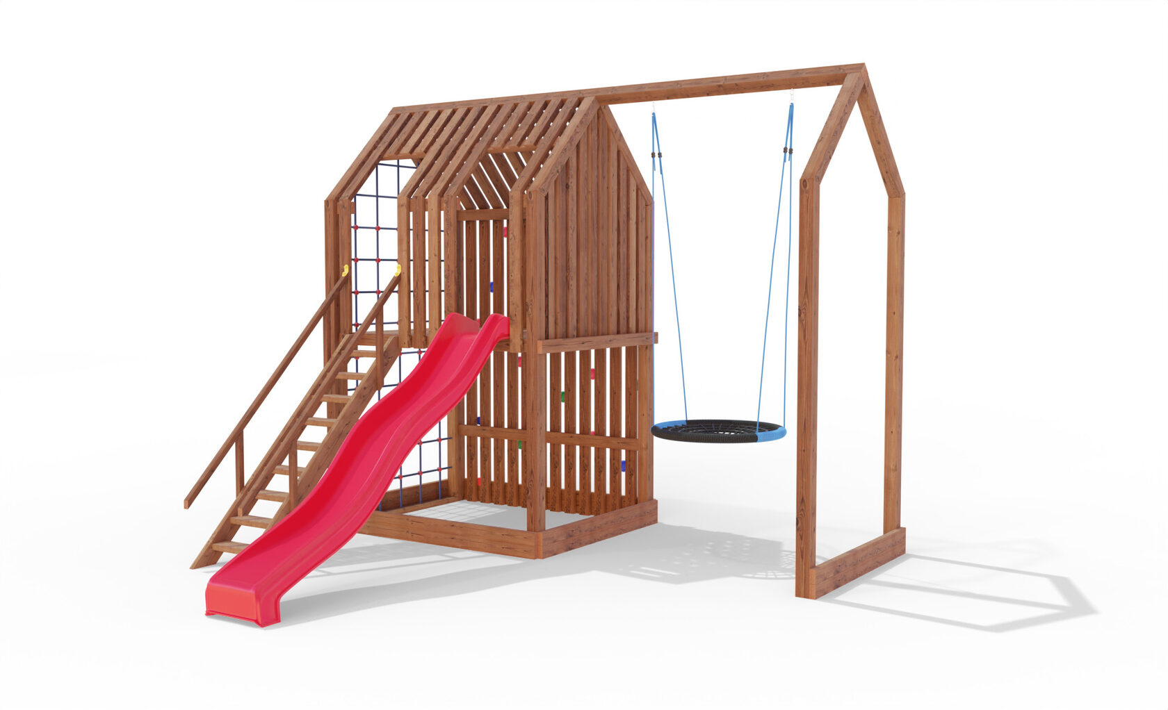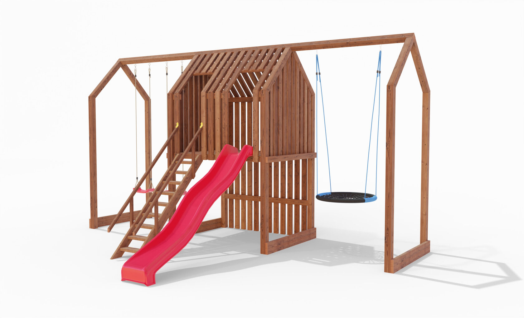 • Башня 1,92*1,6 высота пола 1,5 метра • Деревянная крыша • Лестница пологая угол наклона 45 градусов • Качельная балка на 2 места - 2 шт. • Карабины с подвесами 8 шт. • Качели-гнездо овальные диаметром 1000 мм • Качели-лодочка - 2 шт. • Пластиковая горка длина 3 метра • Инструкция • Все необходимые крепёжные элеиенты для сборки