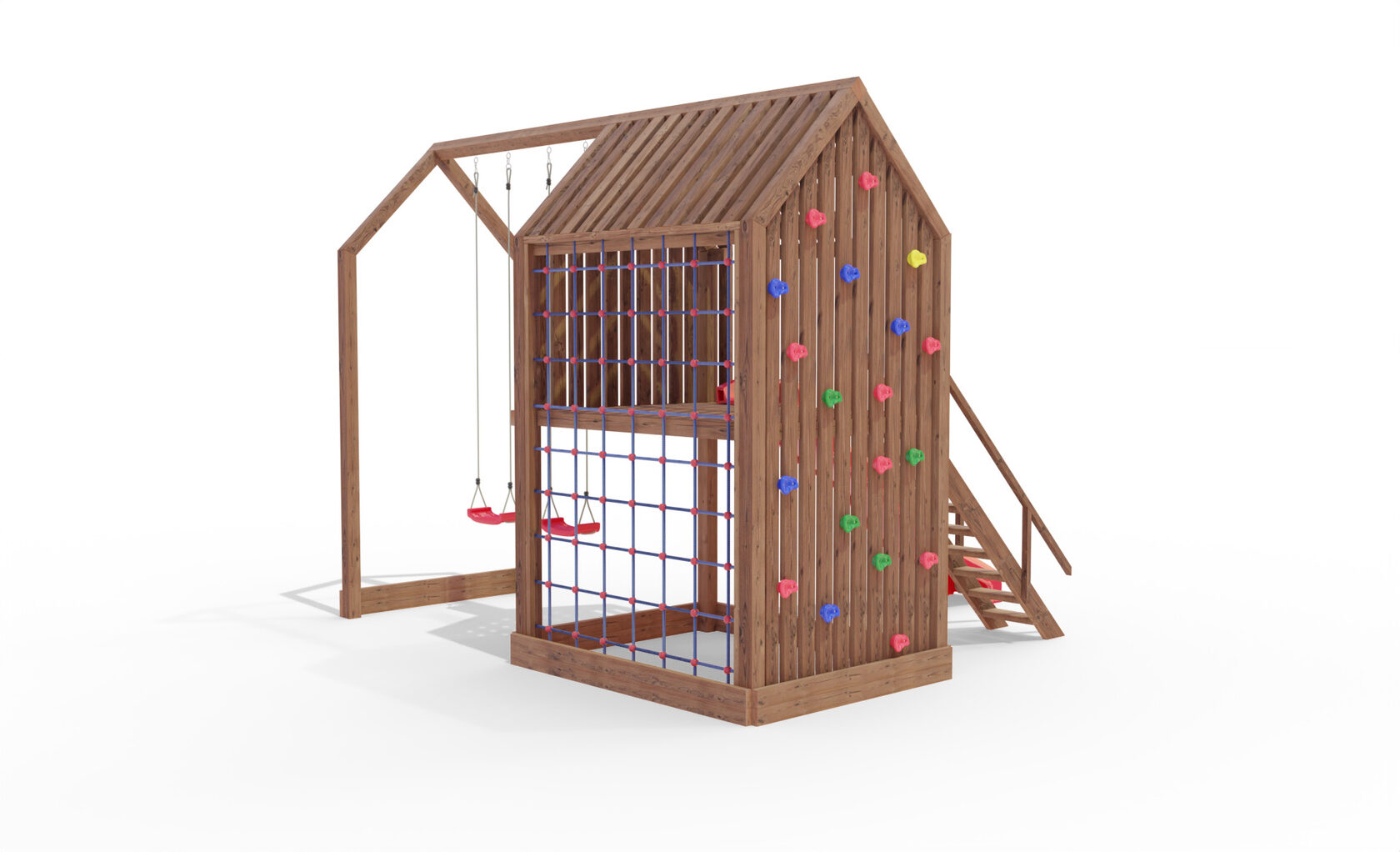• Башня 1,92*1,6 высота пола 1,5 метра • Деревянная крыша • Лестница пологая угол наклона 45 градусов • Верёвочная сетка 1,92*2,4 на заднюю стенку • Камни на скалодром - 23 шт. • Качельная балка на 2 места • Карабины с подвесами 4 шт. • Качели лодочка 2 шт. • Пластиковая горка длина 3 метра • Инструкция • Все необходимые крепёжные элементы для сборки